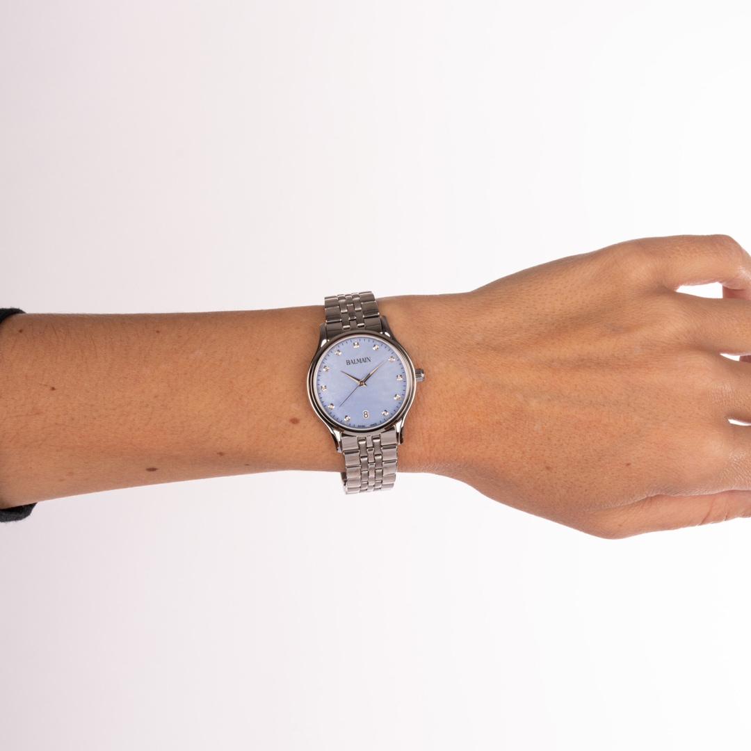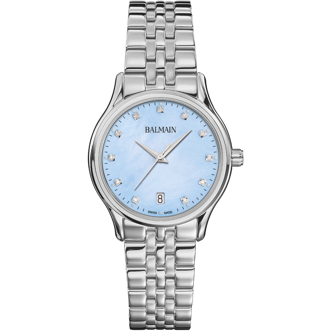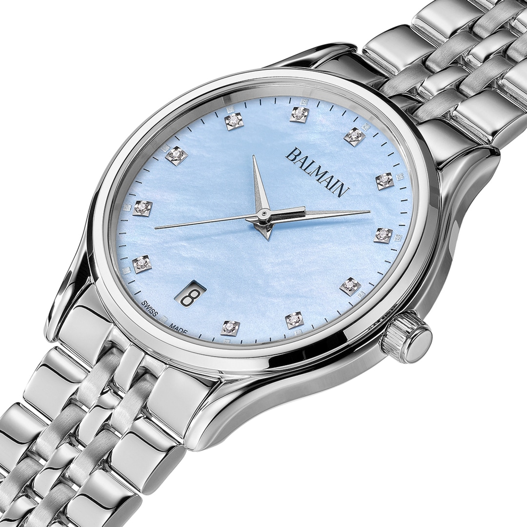Balmain watches, bearing the prestigious Swiss Made label, are manufactured in Saint-Imier, the birthplace of traditional watchmaking in the heart of the Jura. All Balmain watches fulfil the same strict quality criteria: They are available in inexpensive stainless steel versions, elaborate gold or rose-coloured PVD coatings through to extravagant embellishments with diamonds. Every detail is perfectly crafted to fit the red carpet of the stars or the city pavement, complementing today's dynamic male and female lifestyles. The decoration with arabesques is a characteristic accent in the design of the timepieces. Balmain watches are committed to carrying the tradition of customised time into the future. Swiss watchmaking expertise and innovation have resulted in collections that accurately reflect the sophistication and allure of haute couture. Bold, attractive shapes characterise the signature of the watches. The history of the watch brand includes a series of premieres and sensational designs. In the 1990s, Balmain used diamond settings in steel watch cases in an unprecedented way. In 1998, the Chronolady presented the world's smallest chronograph for a ladies' watch.
