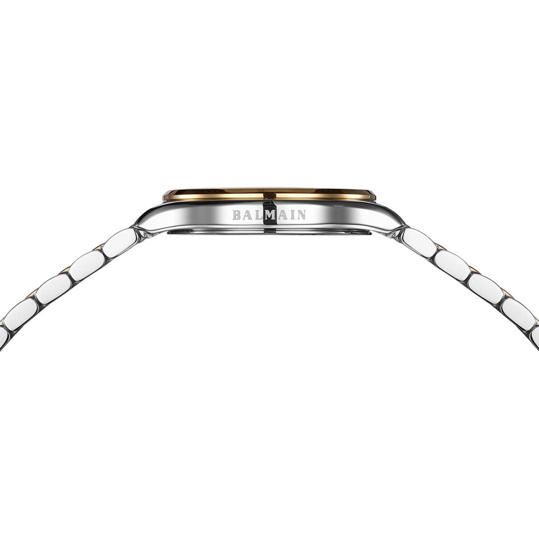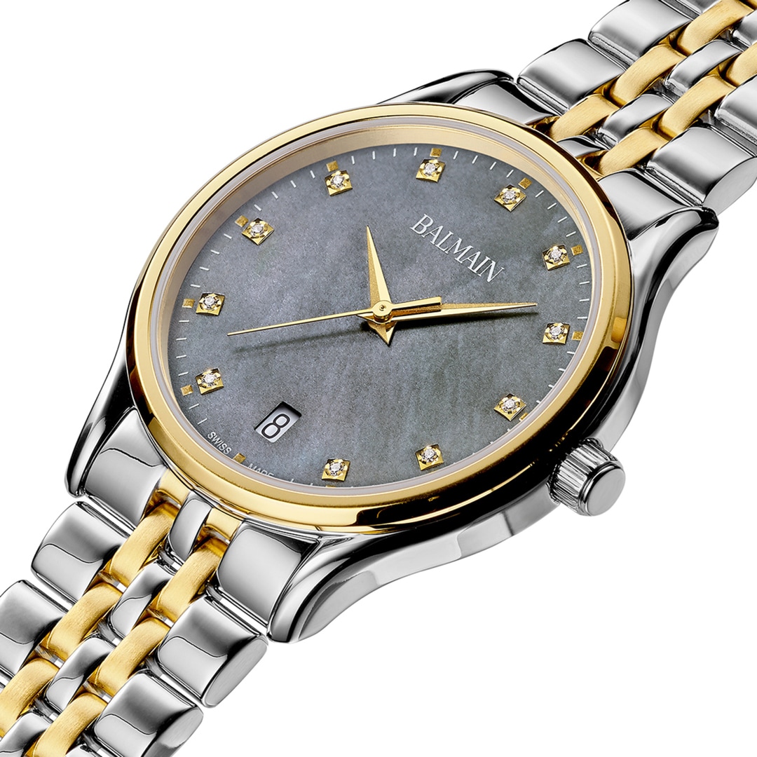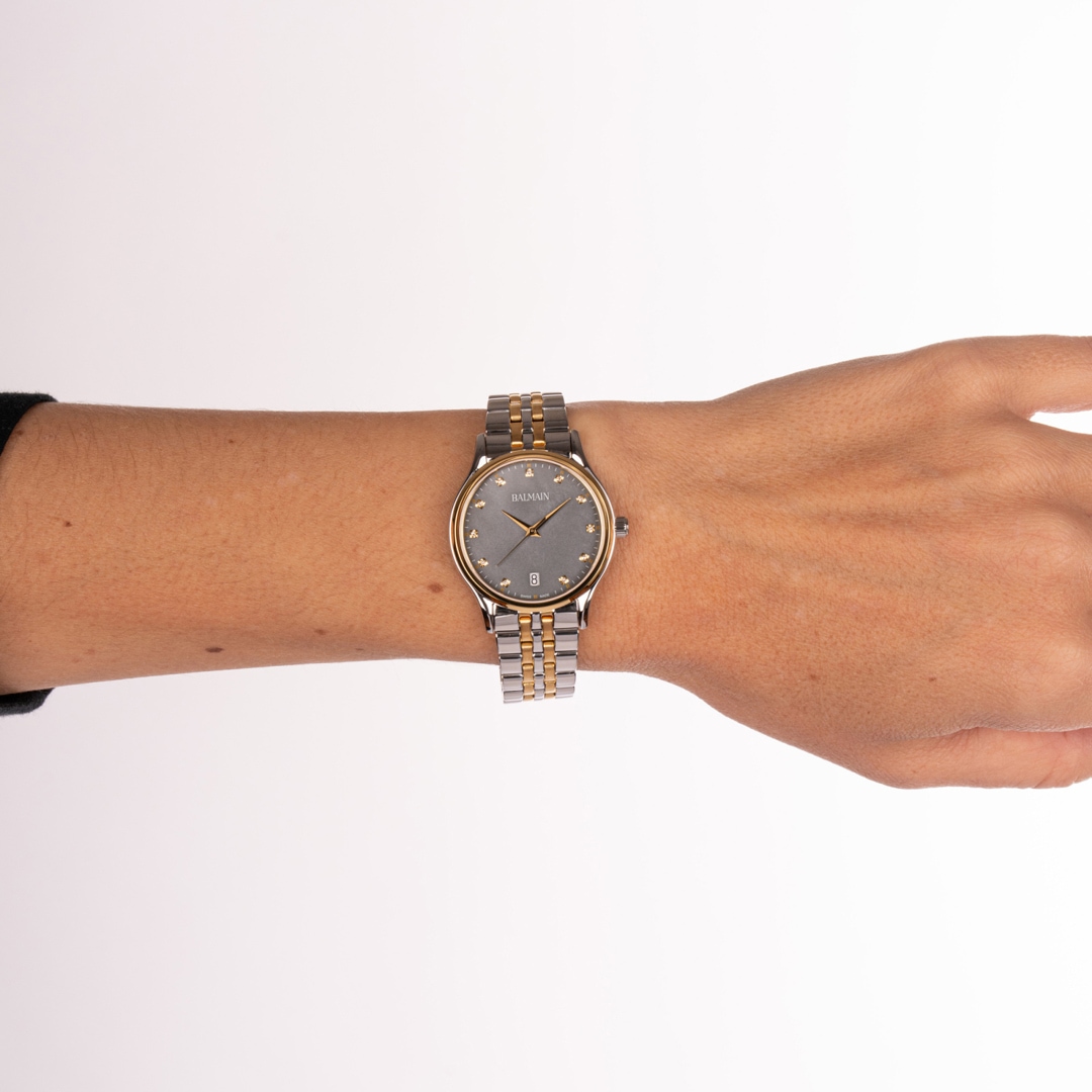 Balmain watches, bearing the prestigious Swiss Made label, are manufactured in Saint-Imier, the birthplace of traditional watchmaking in the heart of the Jura. All Balmain watches fulfil the same strict quality criteria: They are available in inexpensive stainless steel versions, elaborate gold or rose-coloured PVD coatings through to extravagant embellishments with diamonds. Every detail is perfectly crafted to fit the red carpet of the stars or the city pavement, complementing today's dynamic male and female lifestyles. The decoration with arabesques is a characteristic accent in the design of the timepieces. Balmain watches are committed to carrying the tradition of customised time into the future. Swiss watchmaking expertise and innovation have resulted in collections that accurately reflect the sophistication and allure of haute couture. Bold, attractive shapes characterise the signature of the watches. The history of the watch brand includes a series of premieres and sensational designs. In the 1990s, Balmain used diamond settings in steel watch cases in an unprecedented way. In 1998, the Chronolady presented the world's smallest chronograph for a ladies' watch.