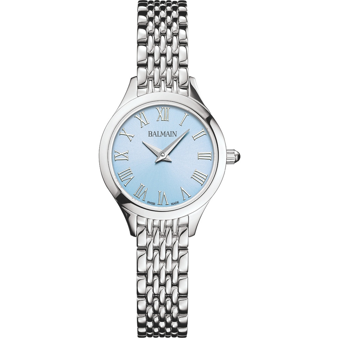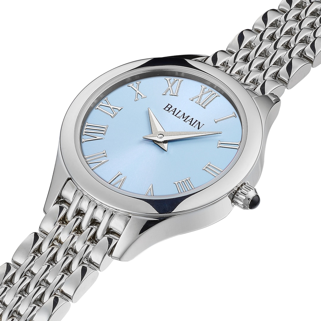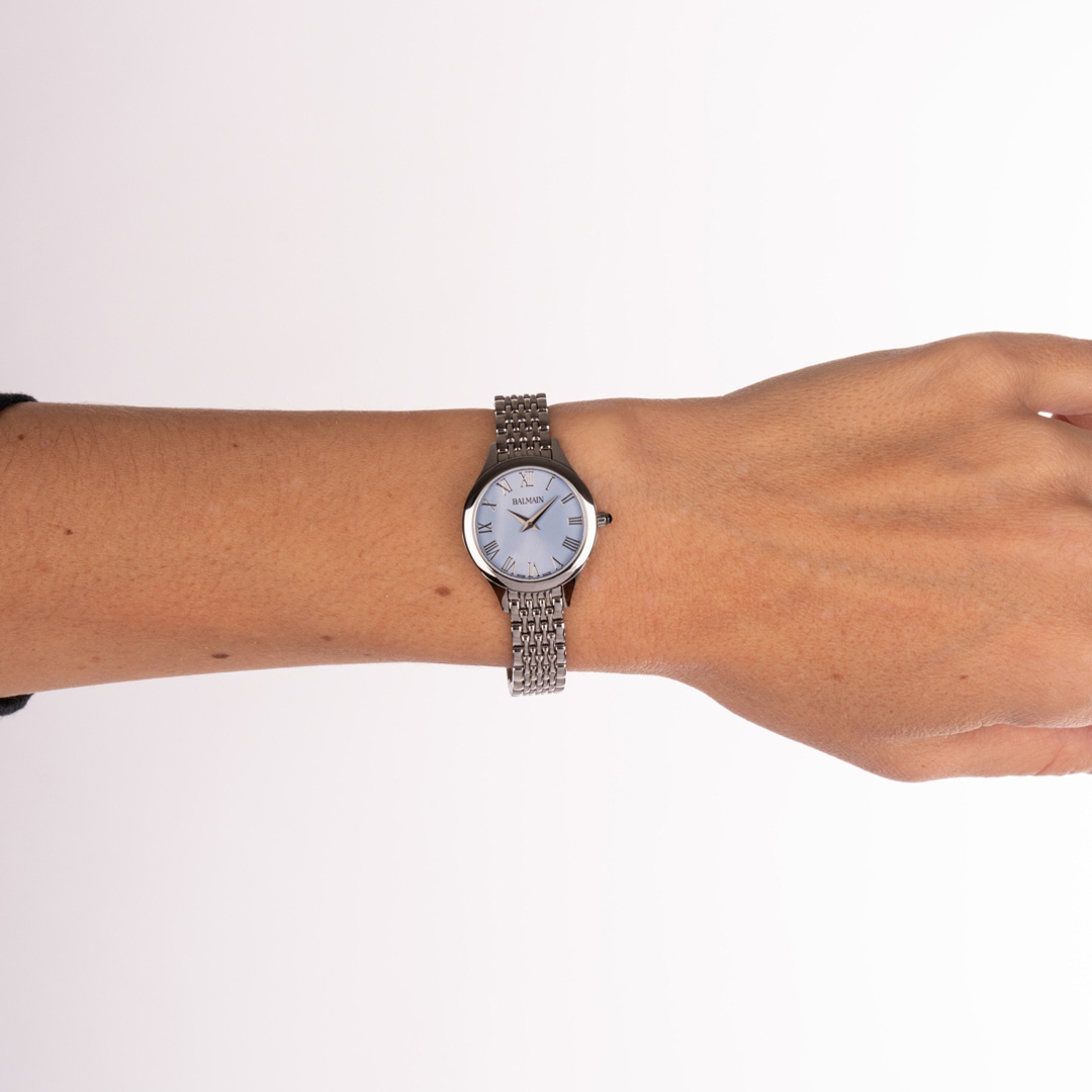 Balmain watches, bearing the prestigious Swiss Made label, are manufactured in Saint-Imier, the birthplace of traditional watchmaking in the heart of the Jura. All Balmain watches fulfil the same strict quality criteria: They are available in inexpensive stainless steel versions, elaborate gold or rose-coloured PVD coatings through to extravagant embellishments with diamonds. Every detail is perfectly crafted to fit the red carpet of the stars or the city pavement, complementing today's dynamic male and female lifestyles. The decoration with arabesques is a characteristic accent in the design of the timepieces. Balmain watches are committed to carrying the tradition of customised time into the future. Swiss watchmaking expertise and innovation have resulted in collections that accurately reflect the sophistication and allure of haute couture. Bold, attractive shapes characterise the signature of the watches. The history of the watch brand includes a series of premieres and sensational designs. In the 1990s, Balmain used diamond settings in steel watch cases in an unprecedented way. In 1998, the Chronolady presented the world's smallest chronograph for a ladies' watch.