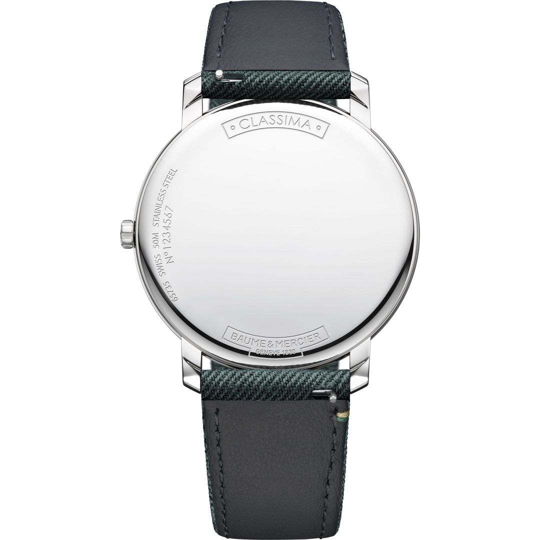 All the Classima Bespoke Edition watches feature a round, curvaceous case in polished stainless steel with a scratch-resistant sapphire crystal and a solid case back that may be engraved and personalized. Each one features an interchangeable strap in fabric and is equipped with a very reliable spring bar system which makes it possible to change the supple strap without tools. The additional leather strap that comes with it offers an opportunity to play with materials, designs and colors. All the straps fasten with a pin buckle.