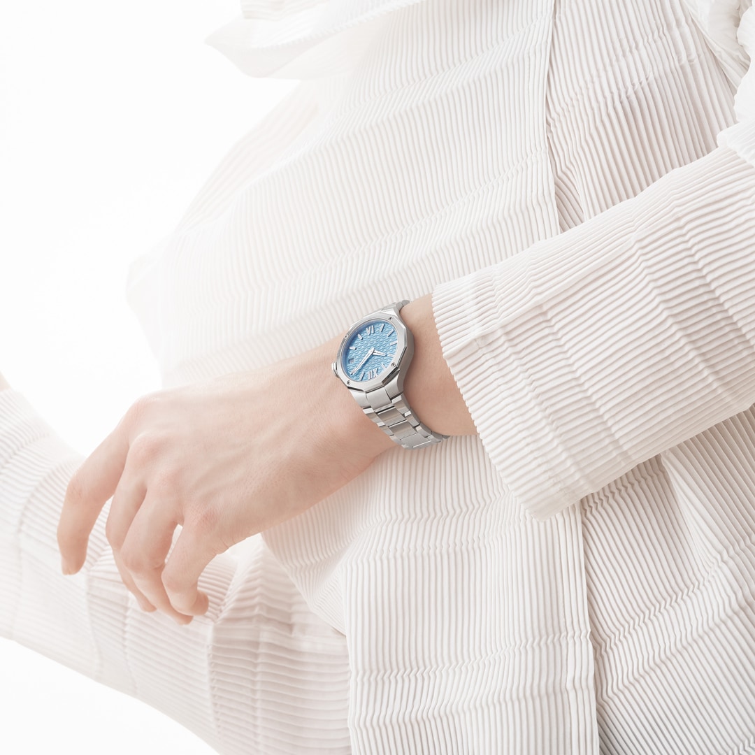 Baume & Mercier presents the Riviera 10811 33mm. The azure blue of this sun satin-finished dial, punctuated by a decoration of tone-on-tone wave transfers, immerses the eyes in a vivifying sea. The dial is adorned by riveted and rhodium-plated Roman numerals and indexes coated with white Superluminova. The faceted, rhodium-plated hands are also coated with white Superluminova (blue emission). The date appears in an aperture at 3 o’clock. It is the essence of Riviera style. For today's women.