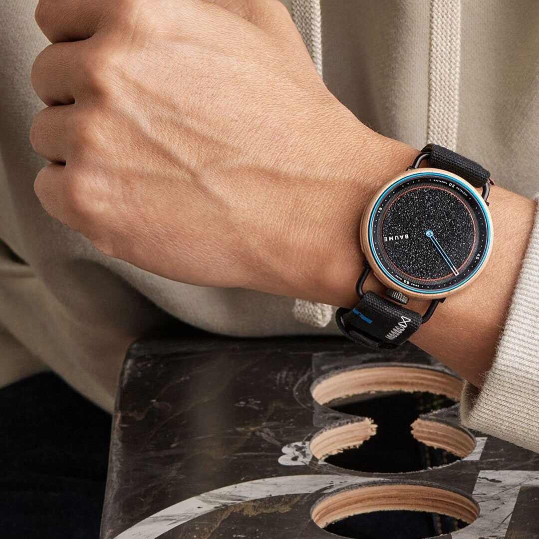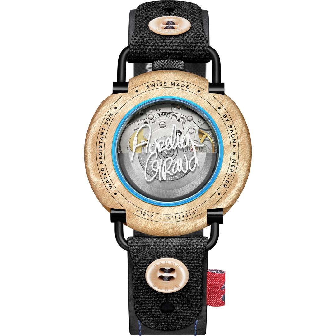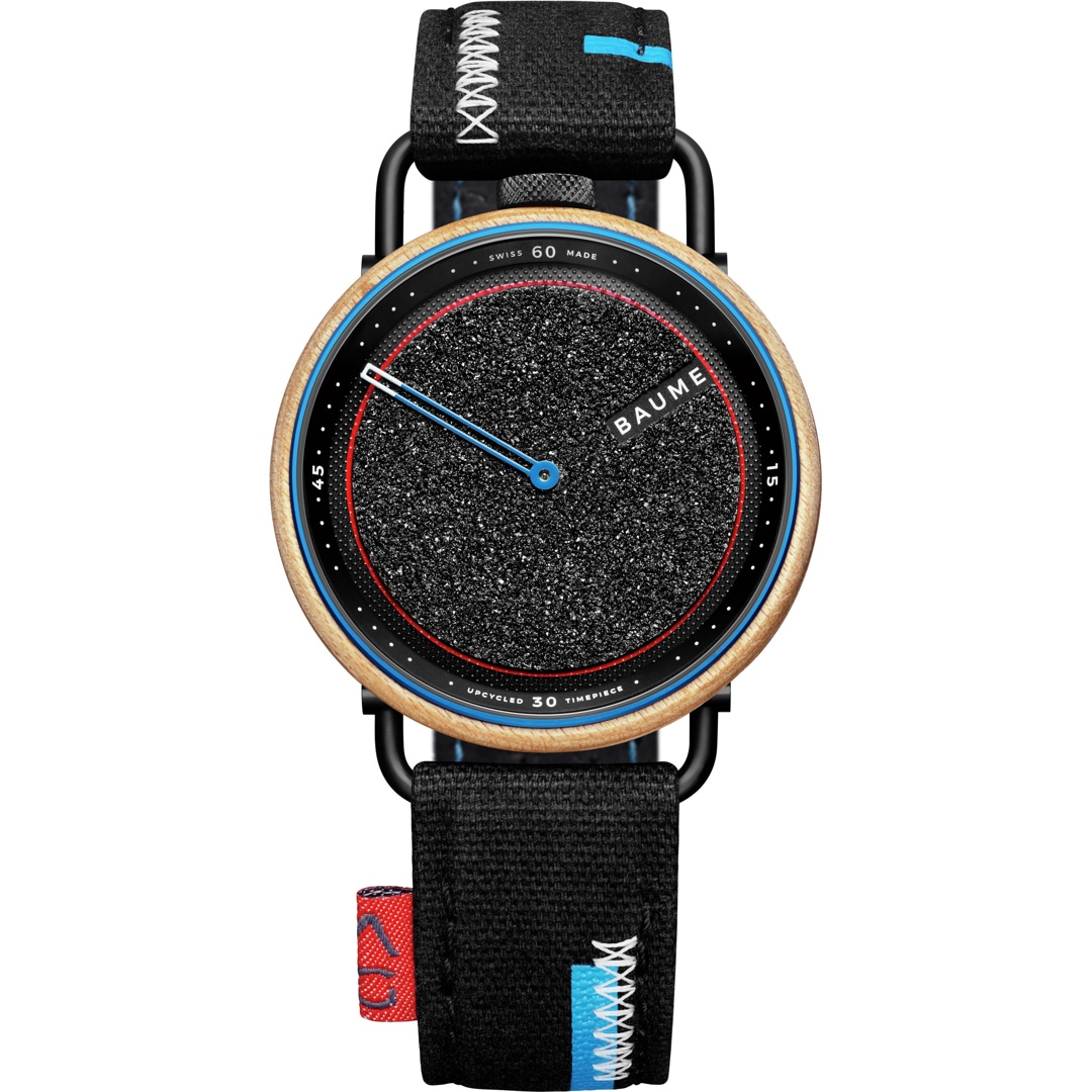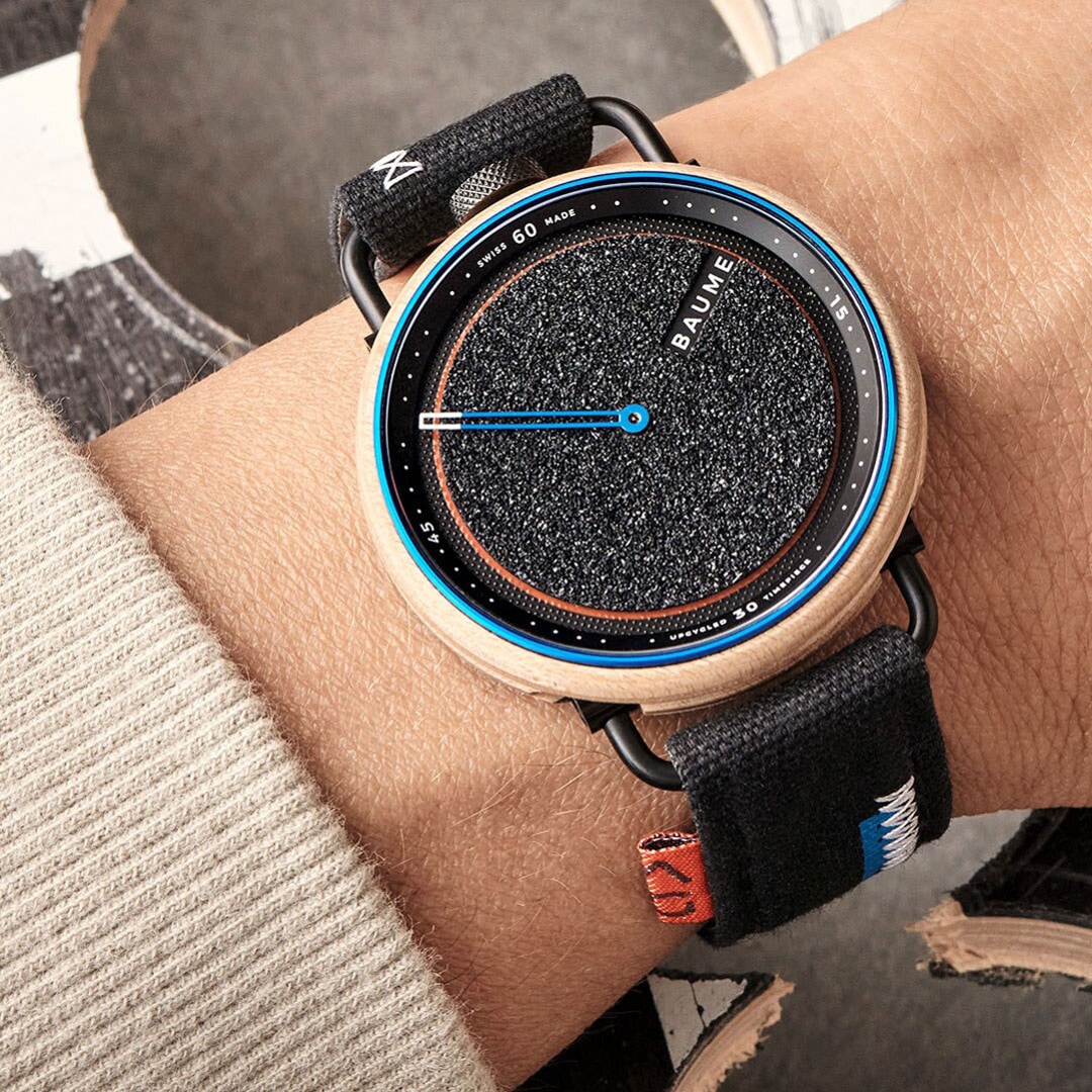 The Baume Skate - Aurélien Giraud Special Edition is a unique timepiece based on upcycling. It features a case made out of skate decks, a dial using skate grip tape and is mounted on a black cotton strap with tag and overlays. The perfect timepiece for skateboard afficionados, curated by Aurelien Giraud himself.