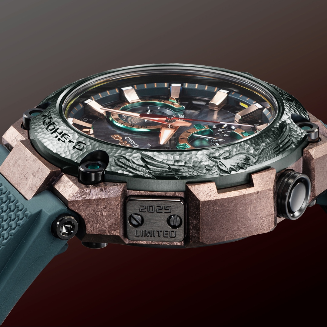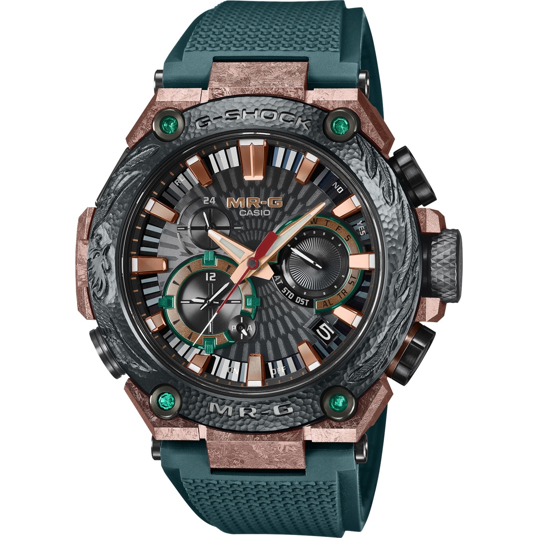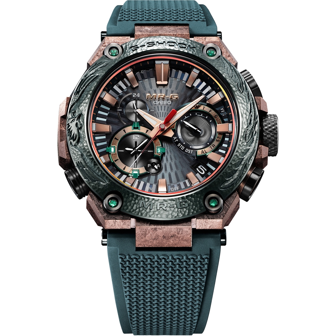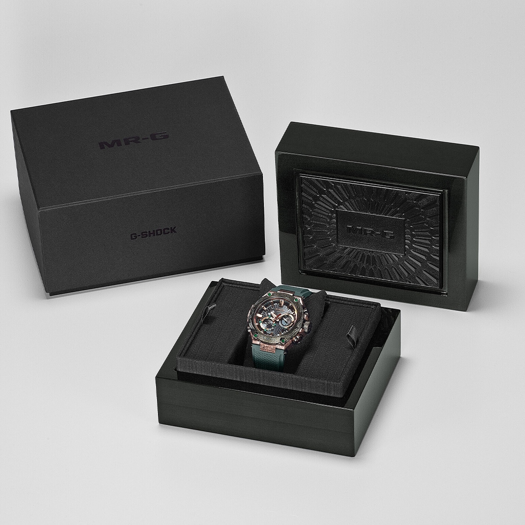 The gradated color of the dial ring captures the dynamic beauty of the phoenix’s graceful flutter. The four bezel screws set with emeralds symbolize wisdom and the power to see the truth. These dazzling elements come together to create one of the most luxurious designs in the MR-G lineup.
