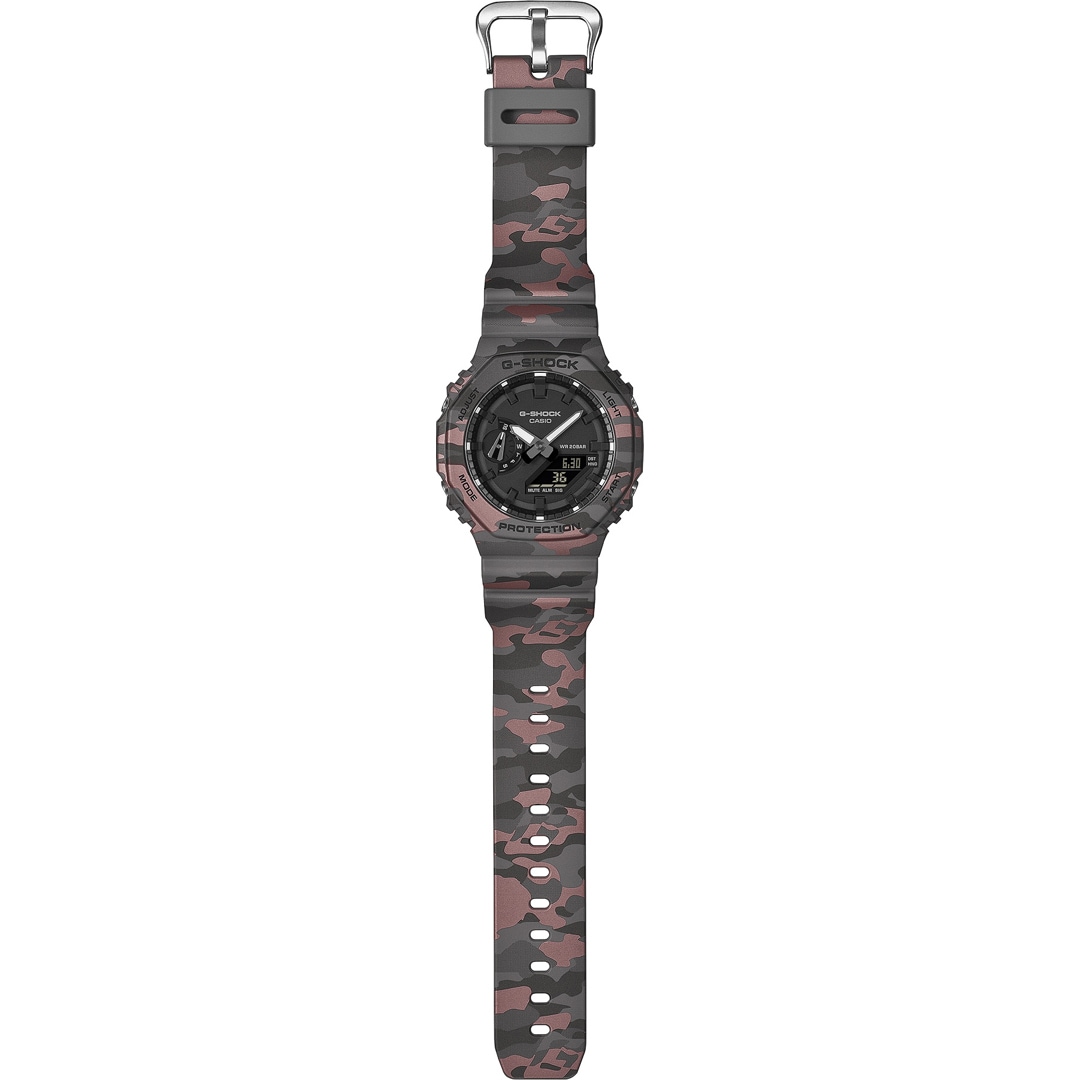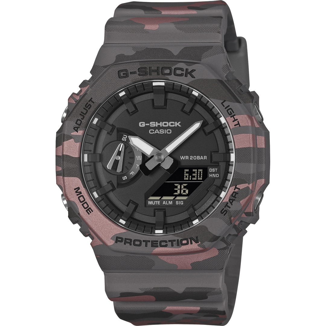Fashion forward, camouflage cool — the ever-popular streamlined GA-2100 takes on an original G-SHOCK camouflage pattern that adds a bold accent to any style.