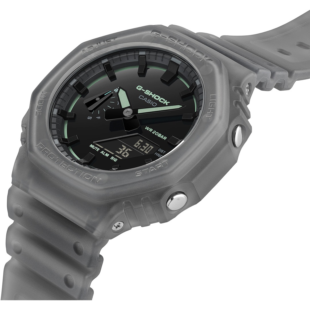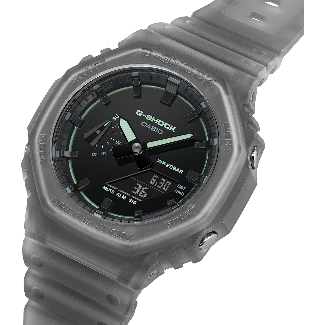 A newly developed surface finish imparts a clean look to the dial that perfectly complements the streamlined design of GA-2100 watches. This smooth surface is the ideal canvas for the glossy finish and rich color scheme, which projects the incredible depth of piano black.