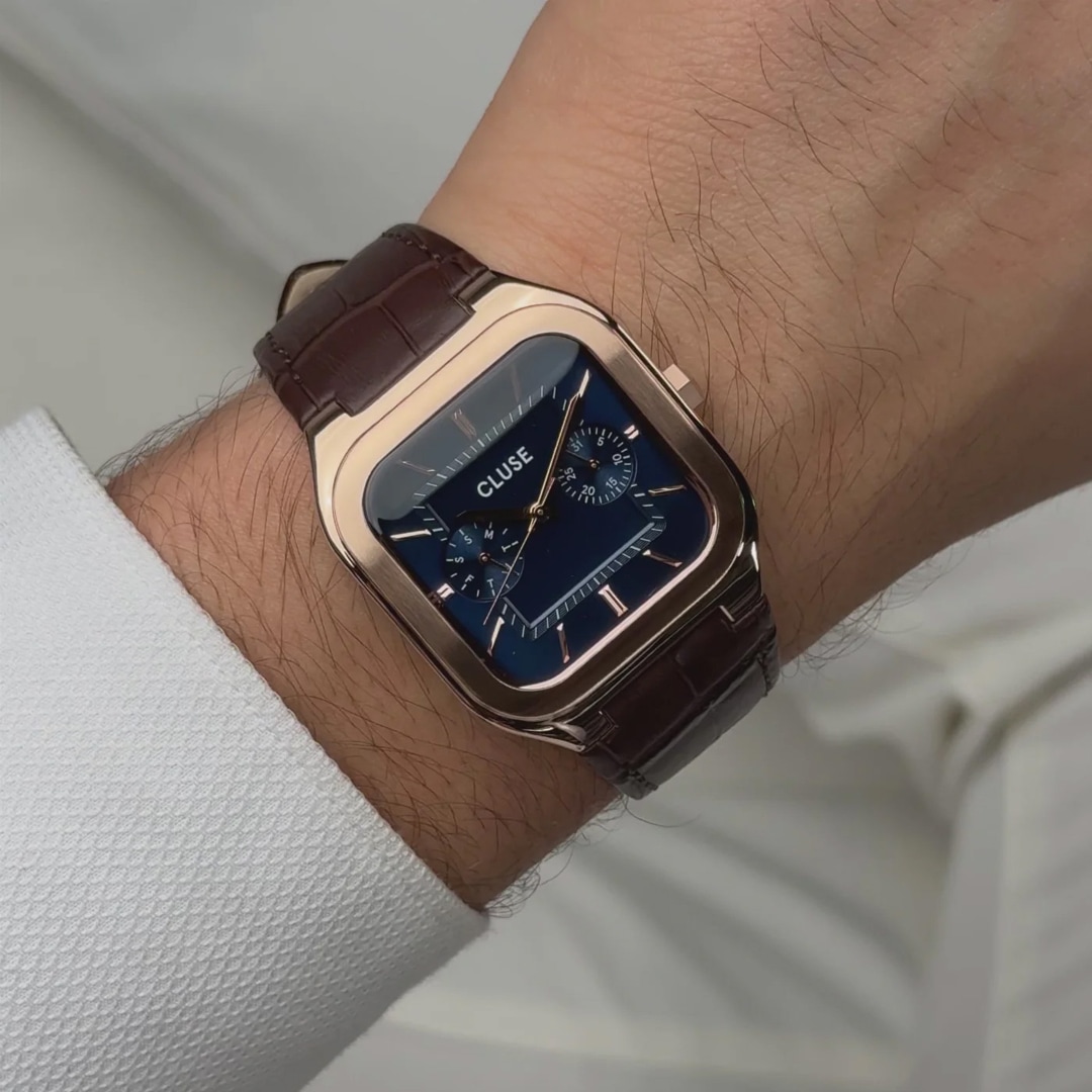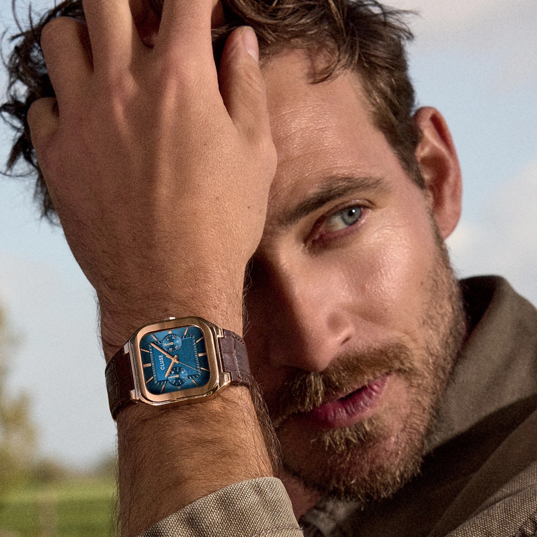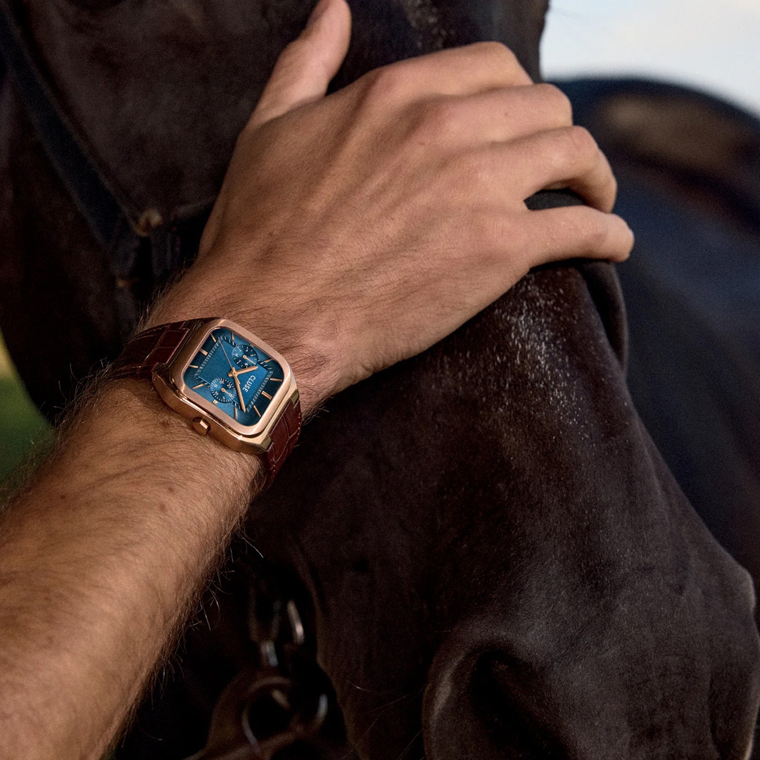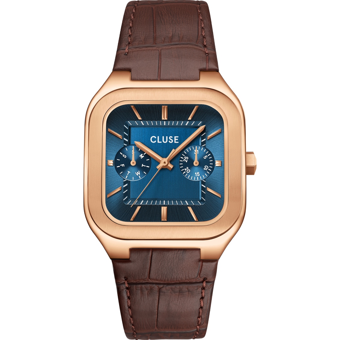 The square Quadrus Multifunction watch for men features a 35 mm rose gold-coloured case, a blue dial with rose gold-coloured details and an 18 mm wide brown leather strap.