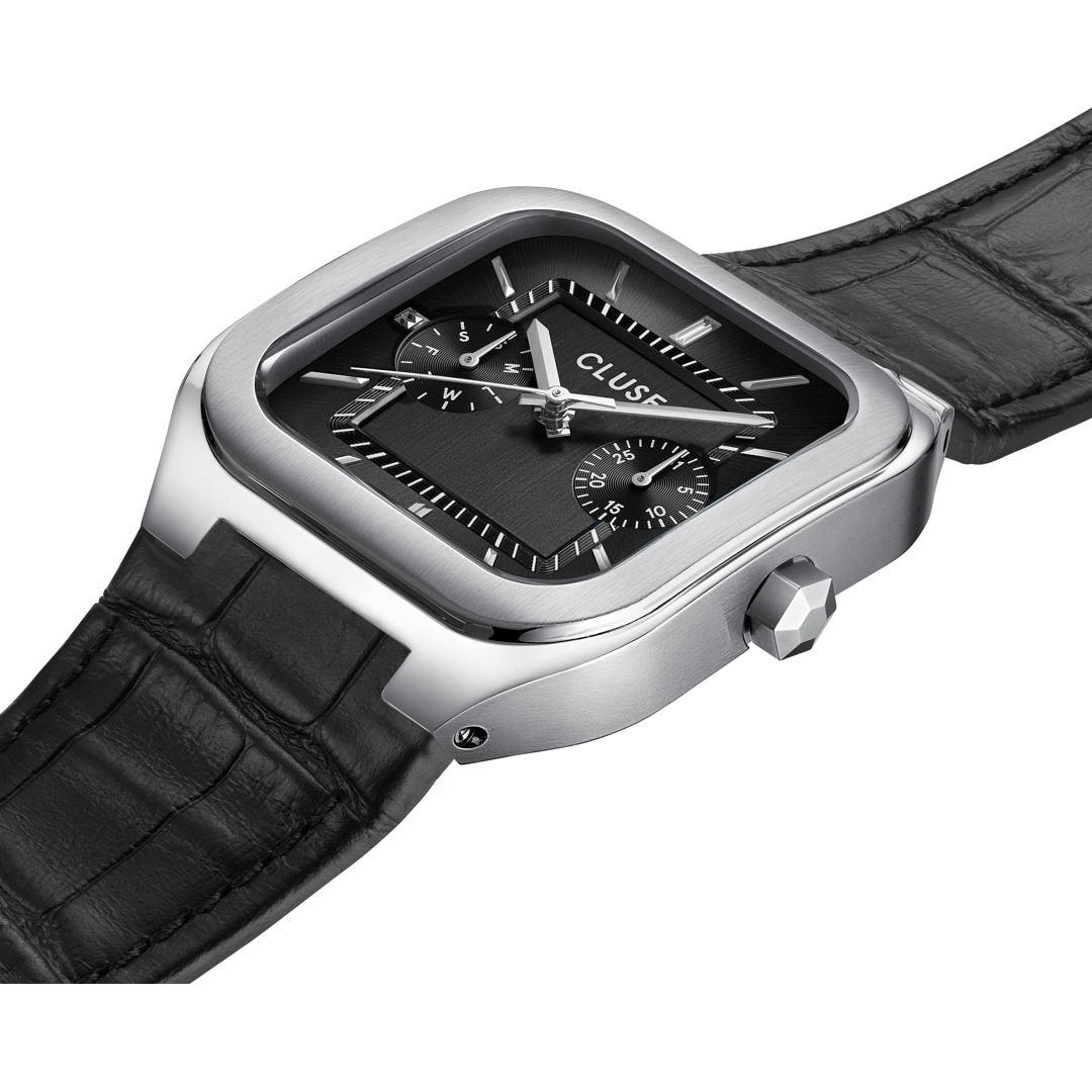 The square Quadrus Multifunction watch for men features a 35 mm silver-coloured case, a black dial with silver-coloured details and an 18 mm wide black leather strap.