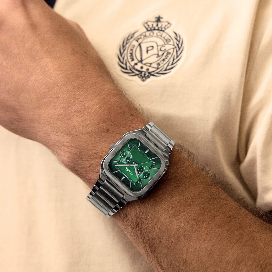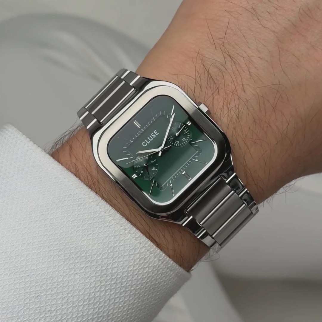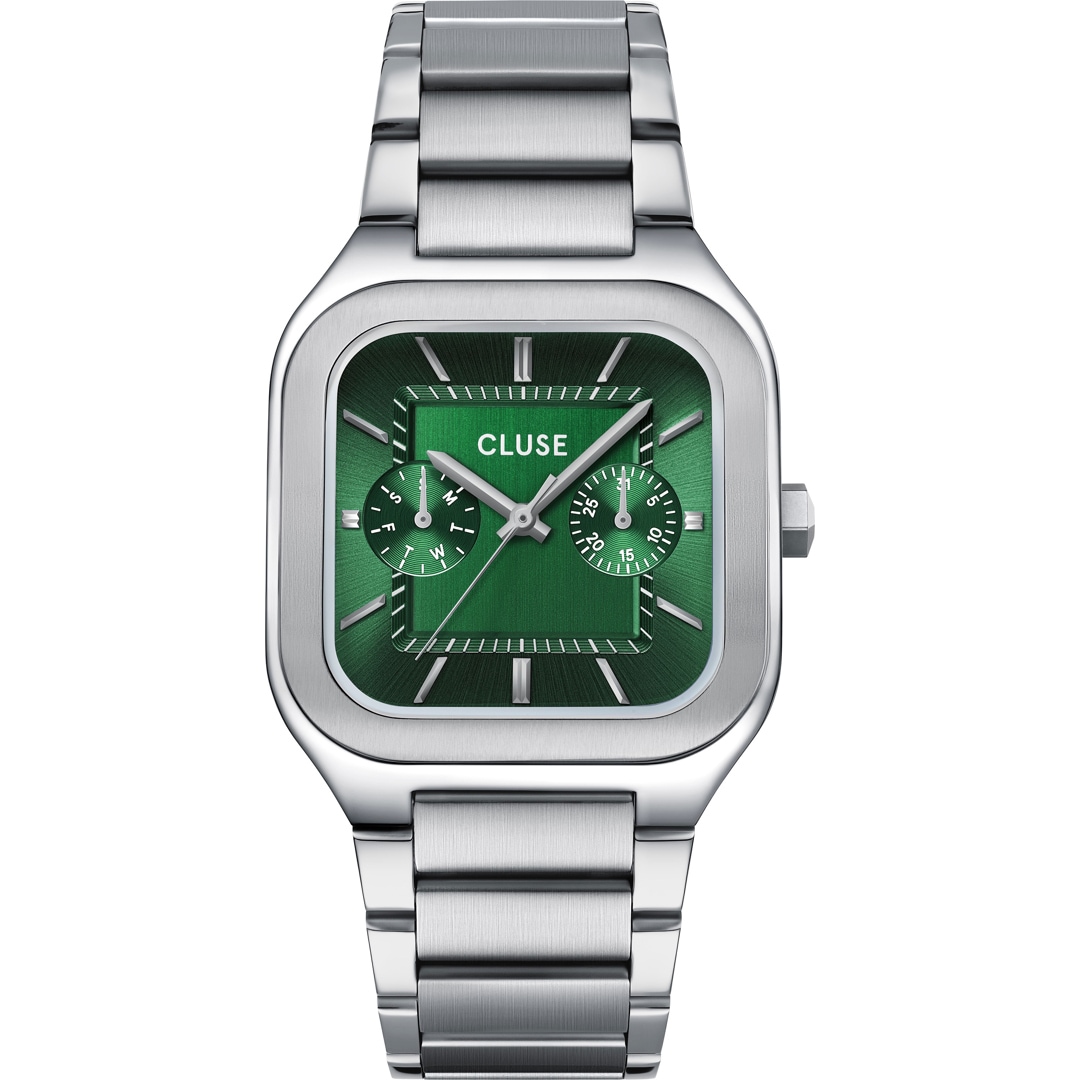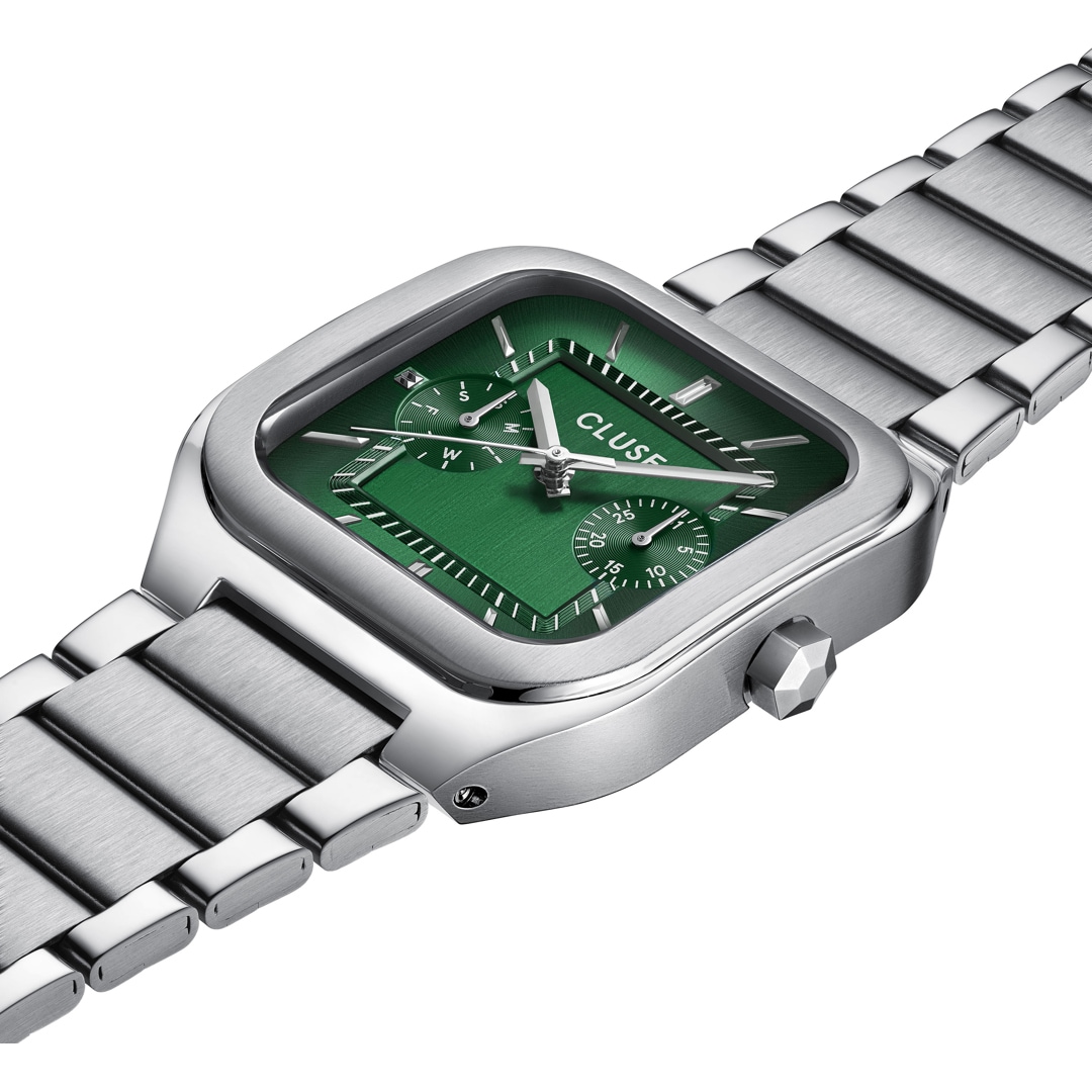 The square Quadrus multifunction watch for men has a 35 mm silver-coloured case, a green dial and a 20 mm wide silver-coloured stainless steel bracelet.