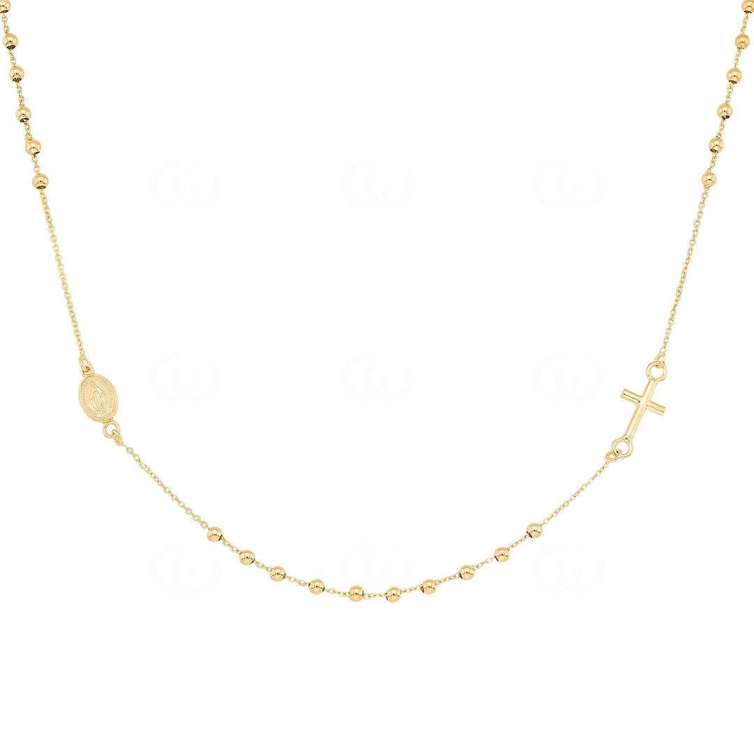 This necklace crafted from 750/18-carat yellow gold is a wonderful example of modern jewellery with deeper meaning. The design integrates two classic symbols of faith directly into the flow of the fine chain, lending the whole piece a playful asymmetry. Accompanied by delicate gold beads, you will find a simple cross here as well as the Miraculous Medal. As the pendant is detailed with embossing on both sides, it unfolds its effect regardless of how it turns while being worn. This piece of jewellery sits lightly on the neck and serves as an elegant talisman that protects you in everyday life while simultaneously highlighting your style with a warm golden glow.