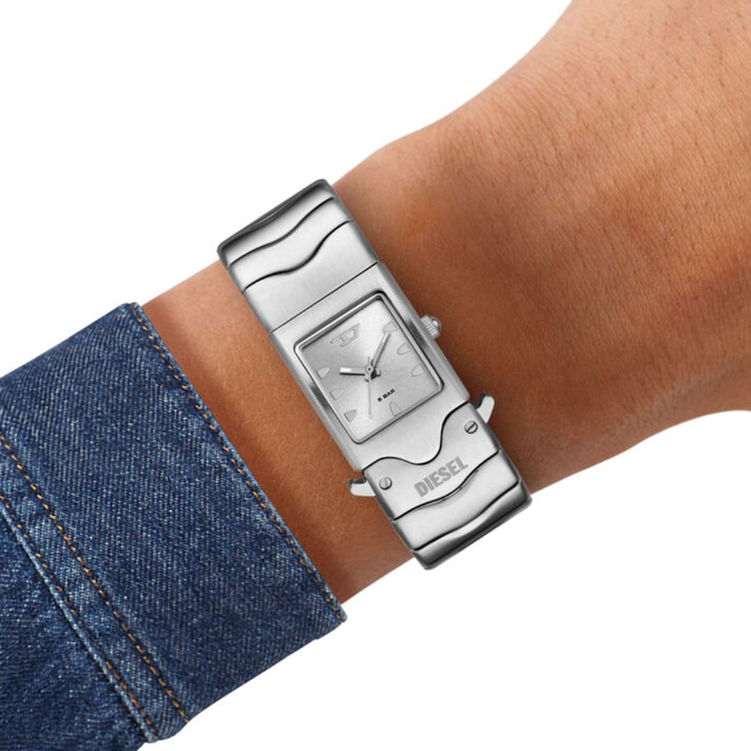 22 mm Diesel Closer wristwatch with silver sunburst dial, three-hand movement and silver stainless steel bracelet with buckle clasp.