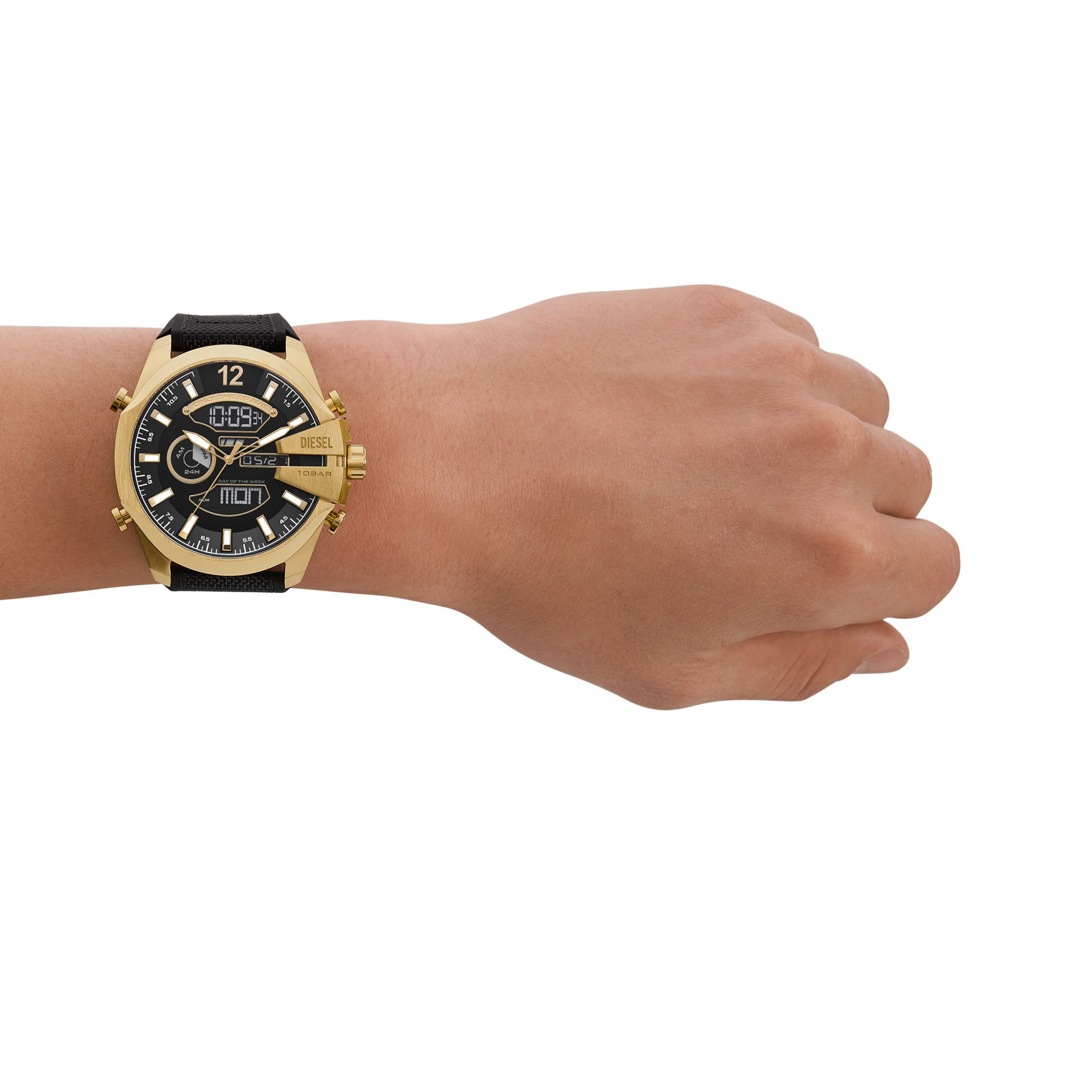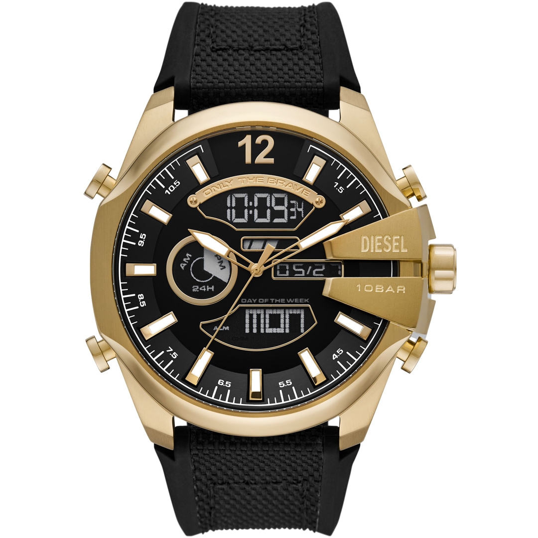 This striking multifunction watch by Diesel undoubtedly and emphatically asserts its masculinity – not only through its "only the brave" inscription on the dial. This Mega Chief with a 51mm case features an analog-digital movement, a sunray dial with stick indices, and a nylon and silicone strap. For those who don't shy away from water, the Diesel Mega Chief offers 10 bar water resistance, providing added security.