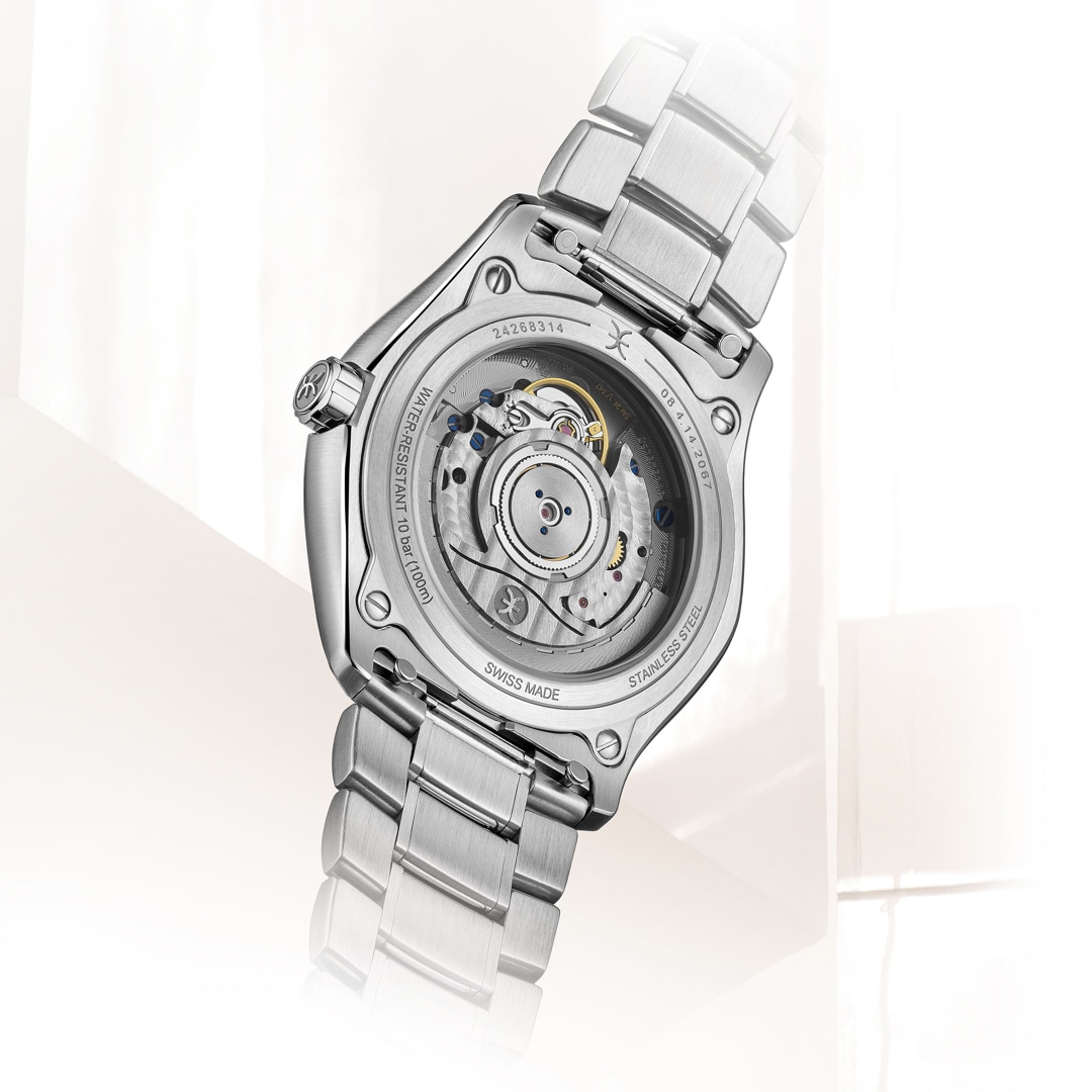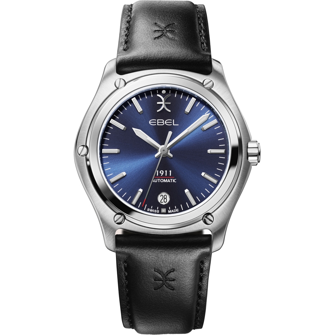 A masterpiece of adaptability and pure style. This EBEL 1911, in its 38 mm stainless steel case, offers luxurious versatility. Wear it on the architectural link bracelet for a distinctive look or switch to the elegant black calf leather strap for a classic appearance. The dial, a work of art in galvanised blue, is illuminated by Super-LumiNova® indices. The true highlight is the Swiss automatic movement, whose precise mechanics can be admired through the sapphire crystal case back. Protected by anti-reflective sapphire crystal on the front and water-resistant to 10 bar, this is a timepiece of sovereign presence.