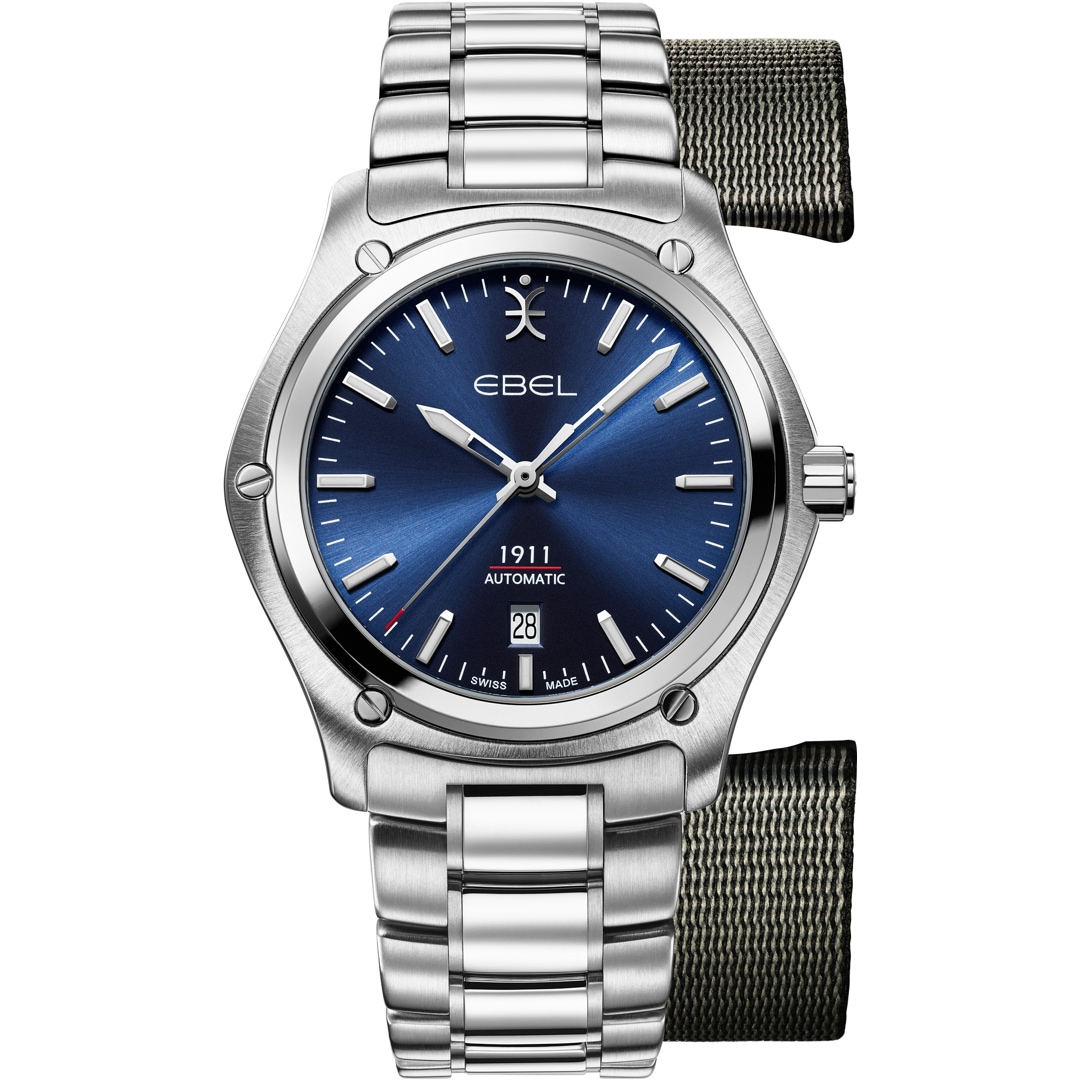 Mechanical sovereignty meets conscious luxury. At the heart of this EBEL 1911 beats a prestigious Swiss automatic movement – a clear commitment to true watchmaking artistry, visible through the sapphire crystal case back. The powerful 42 mm stainless steel case frames a deep blue, galvanised dial, whose applied Super-LumiNova® indices shine beneath anti-reflective sapphire crystal. This timepiece is a master of versatility: it is supplied with the iconic stainless steel link bracelet as well as an innovative fabric strap made from recycled ocean plastic, which is lined with comfortable cork. A companion of distinction, water-resistant to 10 bar.