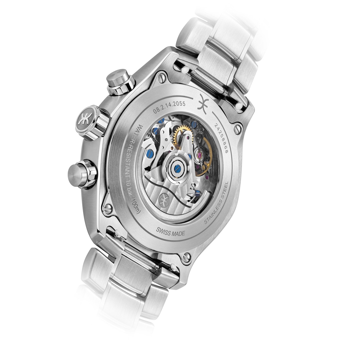 Beneath the sapphire crystal, featuring an anti-reflective coating on the inside, a dial of exquisite, galvanised craftsmanship is revealed, whose applied Super-LumiNova® indices guarantee clear legibility in all light conditions. The sapphire crystal case back reveals the pulsating heart: a precise Swiss automatic chronograph movement.