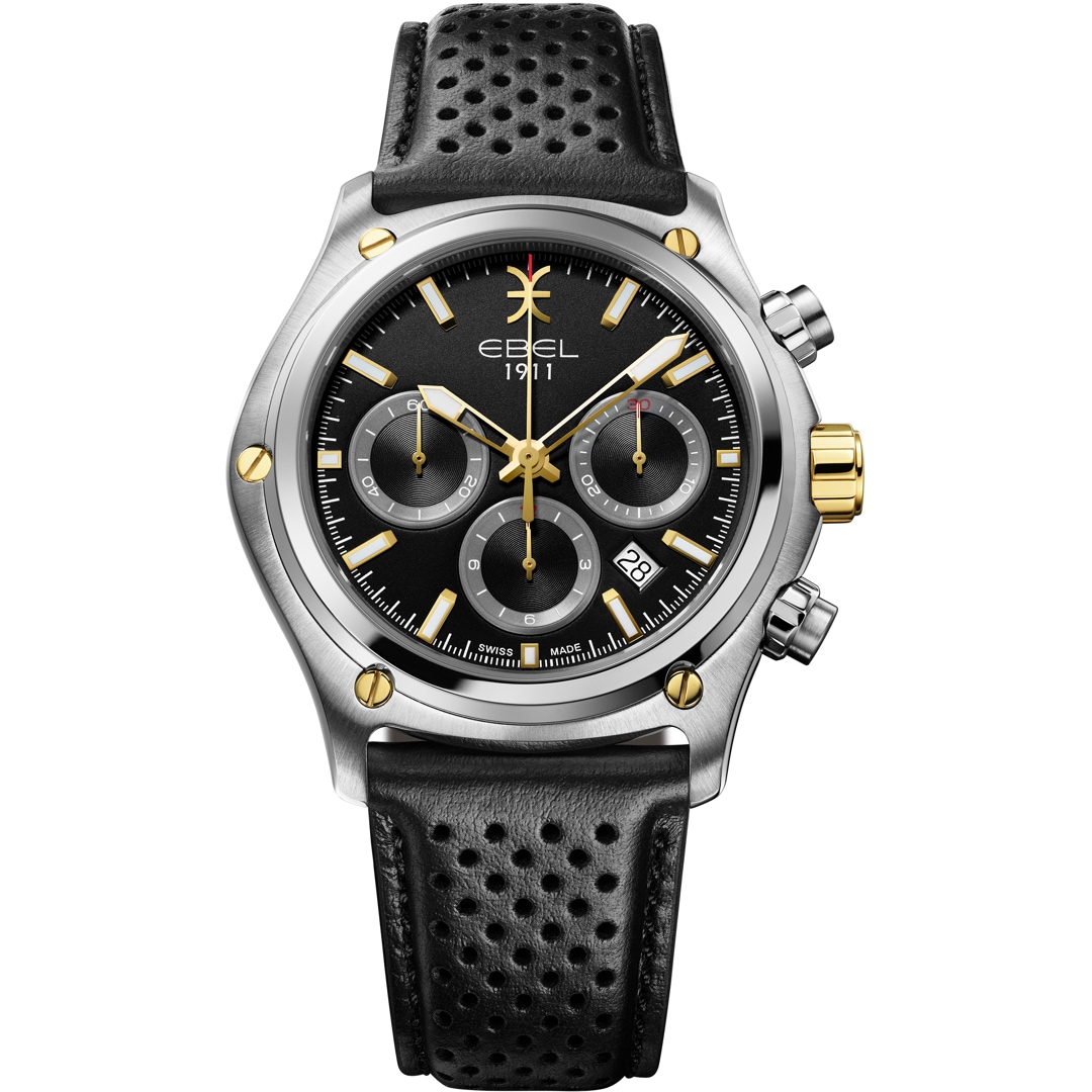 Precision and fine materials unite in this EBEL 1911 Chronograph to make a statement of masculine elegance. The powerful 44 mm stainless steel case is accentuated by characteristic 18-carat yellow gold screws – an unmistakable sign of luxury.