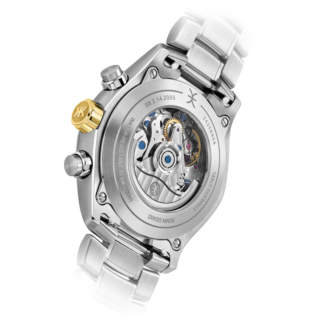 Inside beats a Swiss automatic chronograph movement, its tireless work visible through the sapphire crystal case back. The elaborately galvanised dial offers perfect legibility under anti-reflective sapphire crystal, supported by luminescent Super-LumiNova® indices.