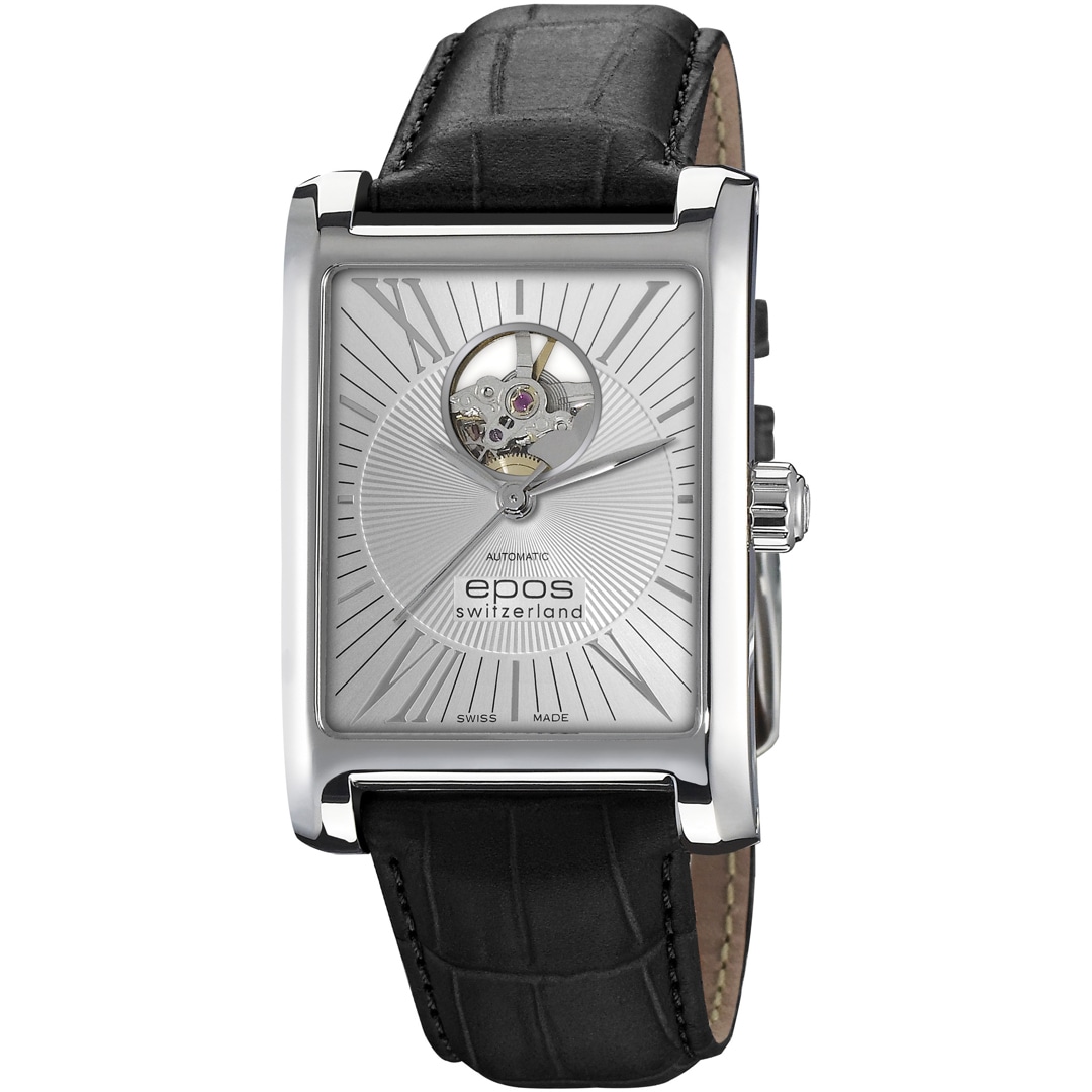 The Epos Timeless 3399 Open Heart is a celebration of elegant design and mechanical artistry. Housed in a fully polished rectangular stainless steel case, this classic automatic watch showcases a refined open heart SW200 movement visible through both the semi-skeletonized silver dial and the transparent case back. The dial combines sunray and engine-turned finishes, accented by applied hour markers — a sophisticated timepiece for those who appreciate timeless style with a glimpse into the inner workings.