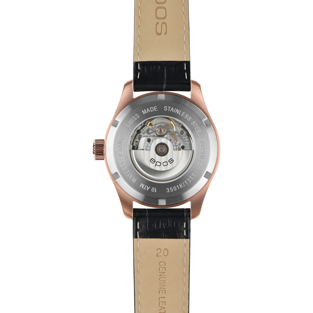 The Epos Timeless 3501 Day-Date is a prominent automatic watch tailored for those who appreciate refined simplicity. Hailing from the distinguished Timeless collection, it epitomizes classic elegance and sleek design, coupled with impeccable quality. Its elegant dial features a weekday indication set against a sunray finish, complemented by luminous index hour markers meticulously applied by hand. The distinctive Passion case, with its 41mm diameter and fine details like bevelled, polished edges, and a logo-adorned crown, exudes understated luxury. Powering this exceptional timepiece is a fully decorated SW 240 movement, including a bevelled and polished rotor adorned with Côtes de Genève, visible through the transparent case back. Elevate your wristwear with the Epos Timeless 3501 Day-Date - a fusion of style, functionality, and craftsmanship.