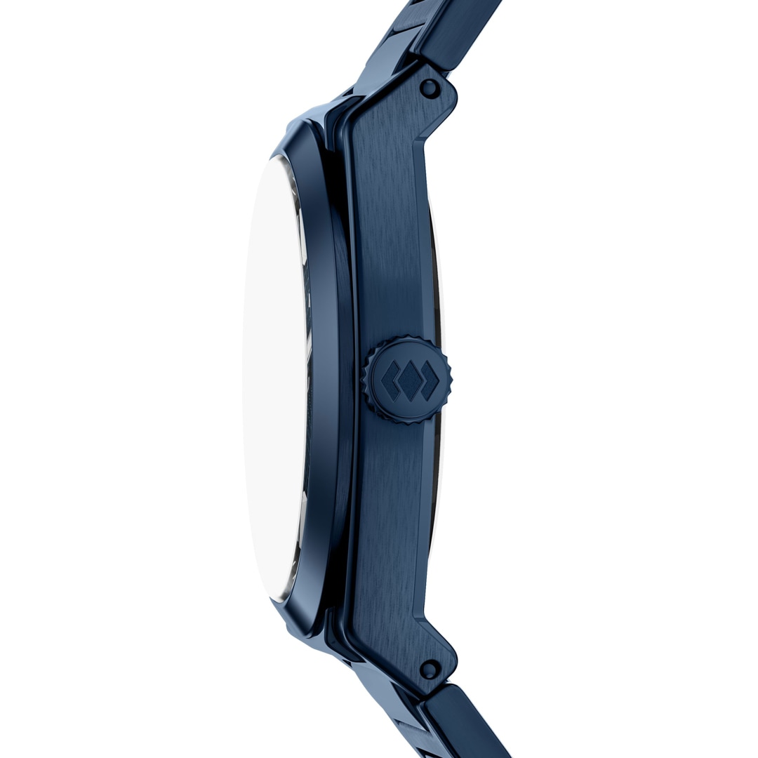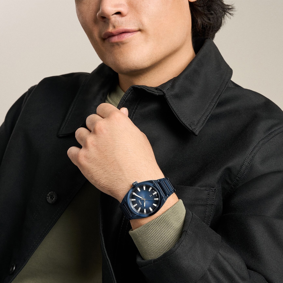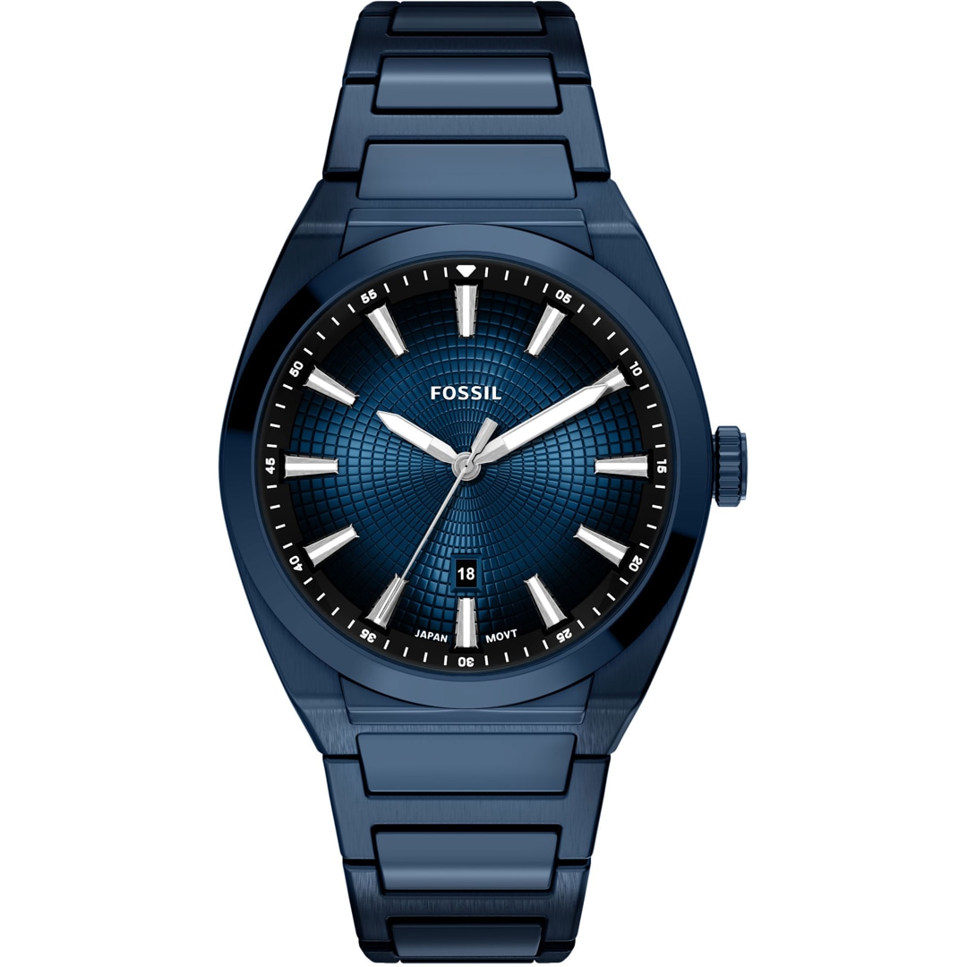 This Everett watch, with a 42 mm case, features a three-hand movement with a date display, a blue sunray dial and a blue stainless steel strap.