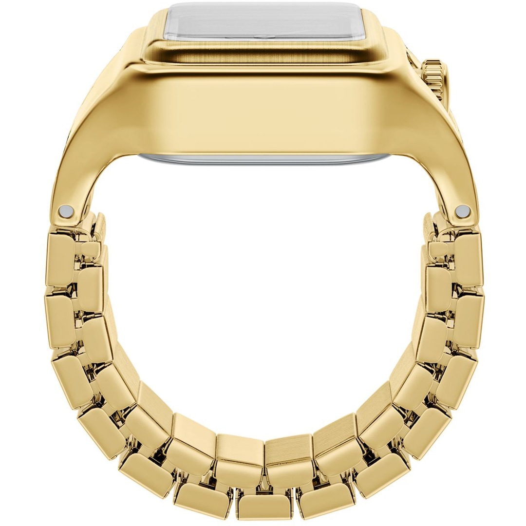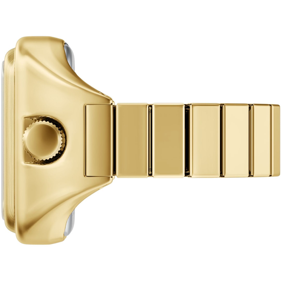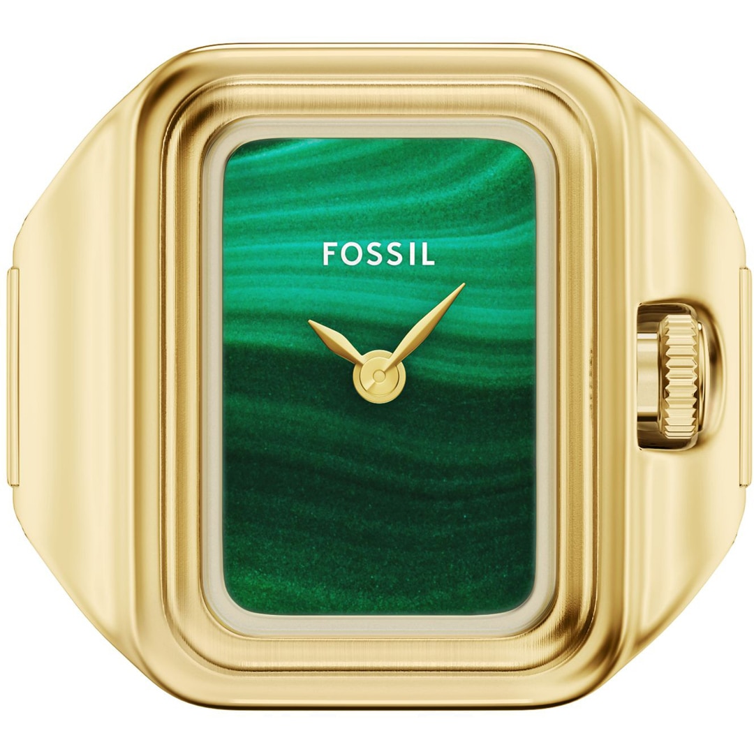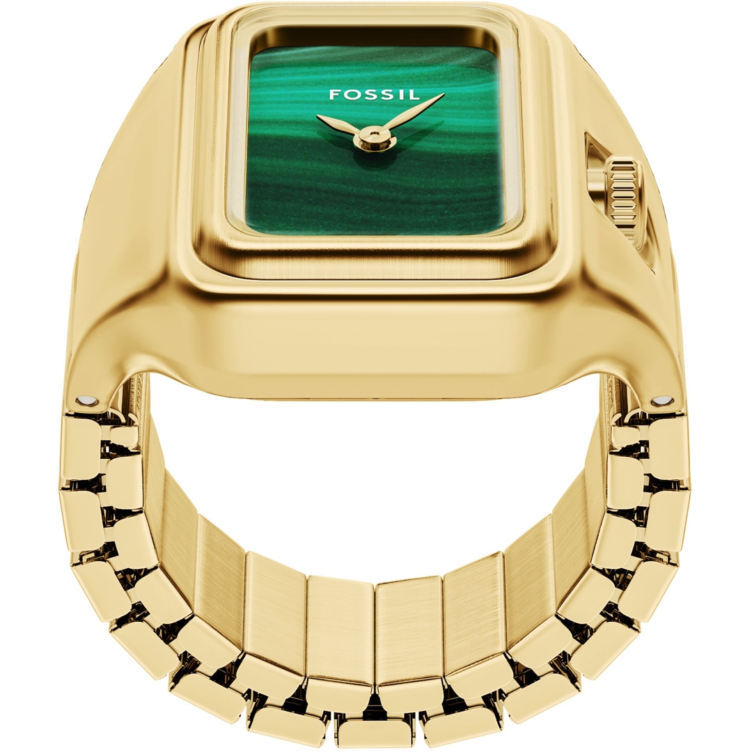 A small rectangular, gold-coloured stainless steel case and a matching strap give this ring watch a streamlined look. The shiny green malachite dial with 2-hand display adds a vibrant pop of colour and understated functionality. The strap has an adjustable clasp for a comfortable, personalised fit.
