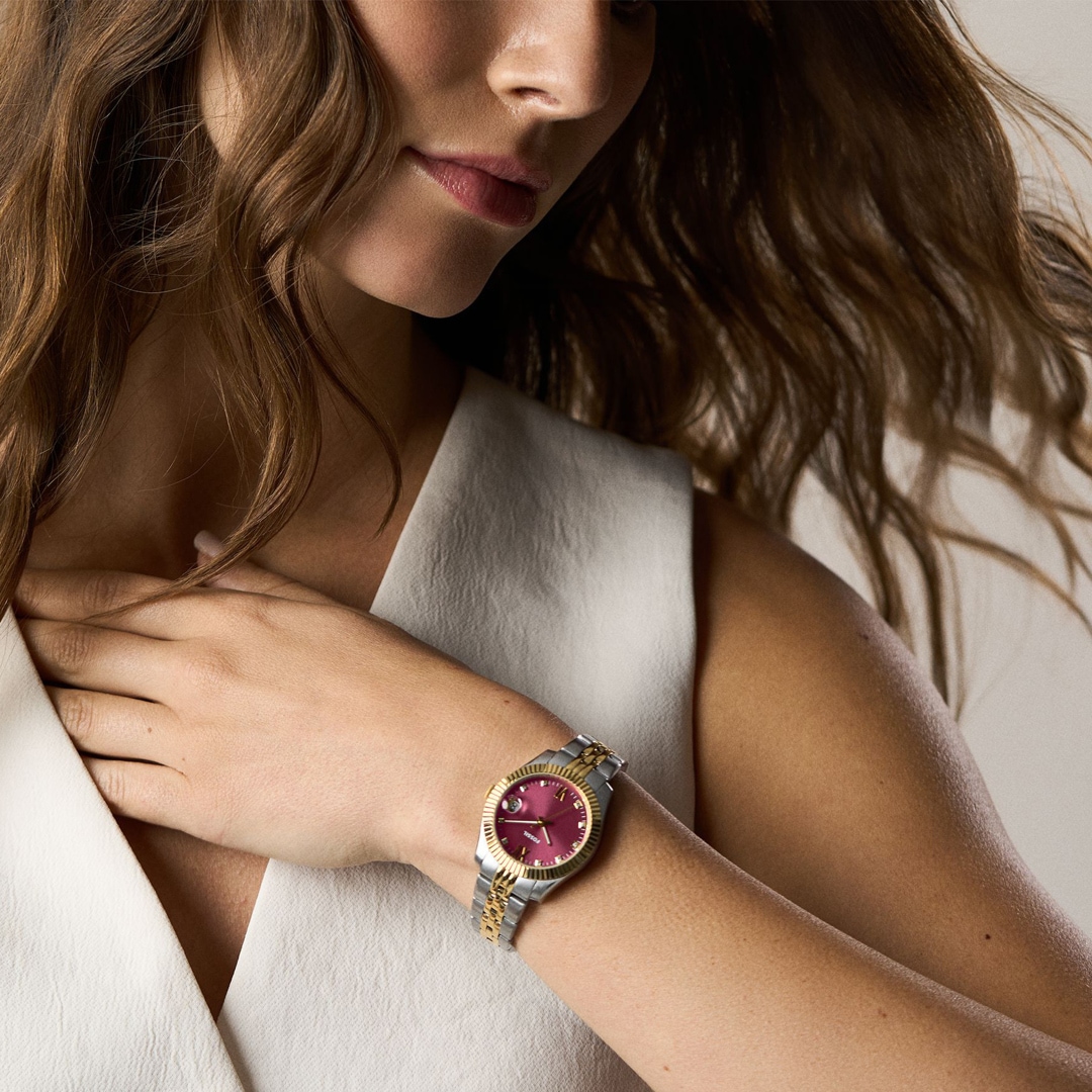 A pink sunray dial adds a vibrant accent to this two-tone watch, complemented by gold-coloured hands and a date window for added functionality. The two-tone case in silver and gold-coloured stainless steel harmonises with the strap, whose interwoven links in silver and gold colours lend the design an elegant touch. A double push-button folding clasp ensures a secure fit and comfortable wear.