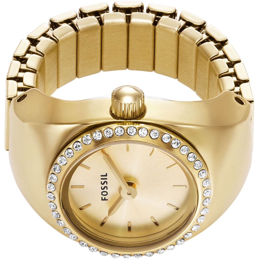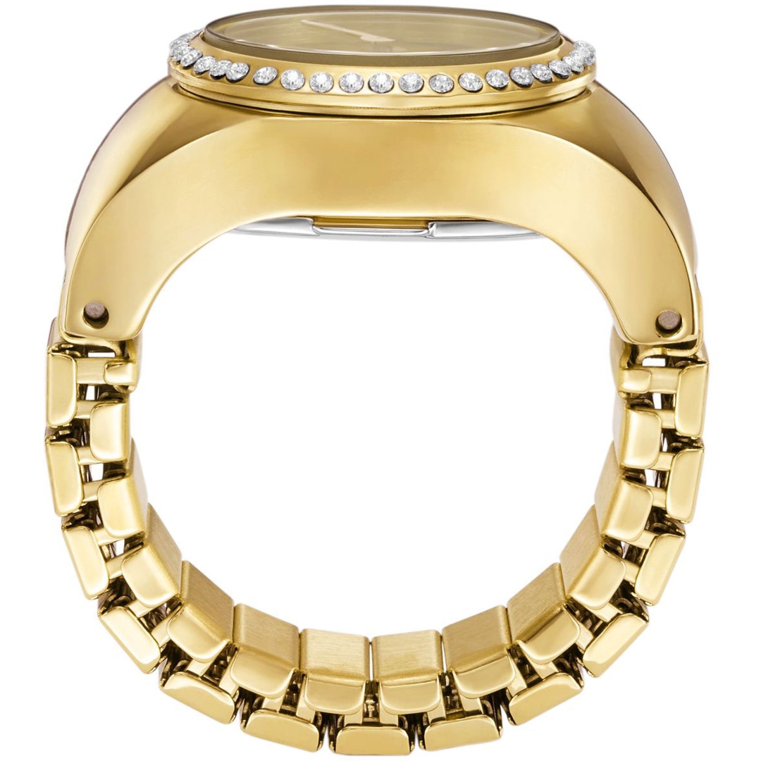 The time is ripe for a very special accessory. Small but mighty: this ring watch with a bezel set with glass stones has a gold-coloured sunray dial and a flexible band that fits any finger.