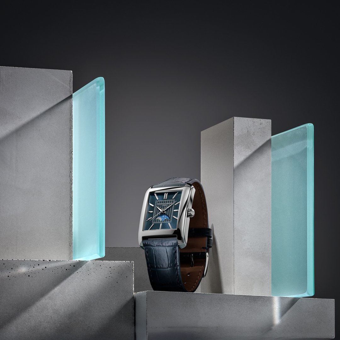 Immerse yourself in the Art Deco design of the 1920s and 1930s with the Classics Carrée Moonphase Automatic. For the first time, this iconic model reveals the poetic complication of the moon phase alone at 6 o’clock. Its rectangular polished steel case frames a hypnotic navy blue sunray dial enhanced with a delicate chevron guilloché pattern. In the centre, the moon and stars are displayed against a mesmerising astral blue background. Powered by the FC-333 automatic calibre, it is the embodiment of timeless elegance.