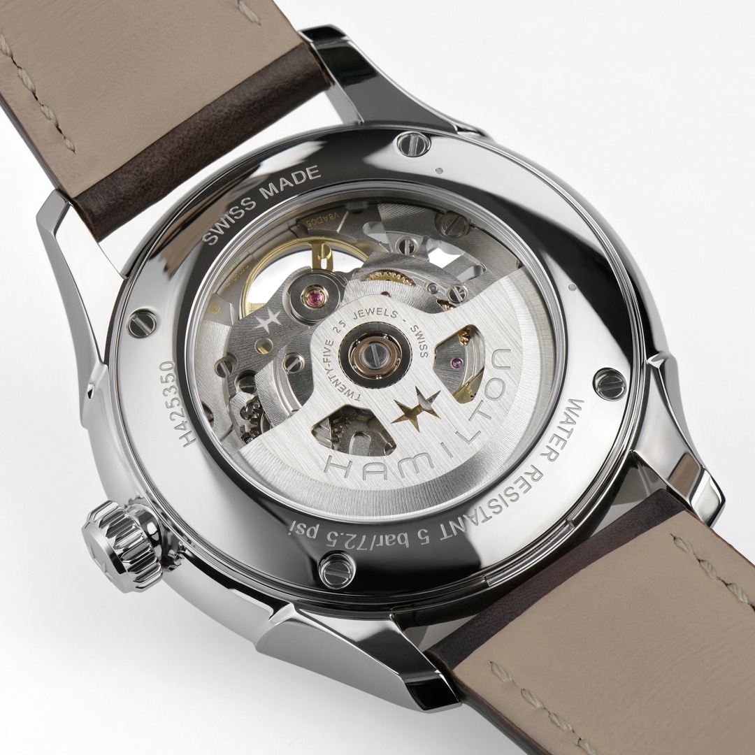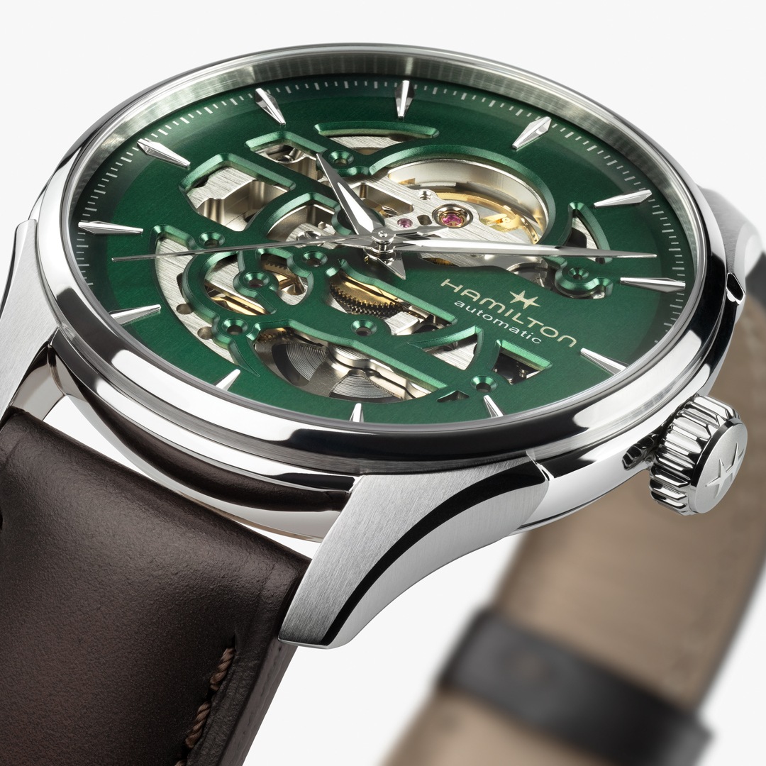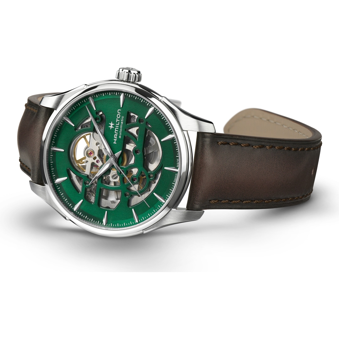 Seamlessly blending tradition with innovation, the Jazzmaster Skeleton 40mm offers a glimpse of its Swiss automatic movement in action. Set in striking Empire green, the open-worked dial reveals the automatic H-10-S movement, featuring 25 jewels and an impressive 80-hour power reserve. This iconic timepiece is paired with a smooth leather strap, exuding both modern dynamism and timeless appeal.