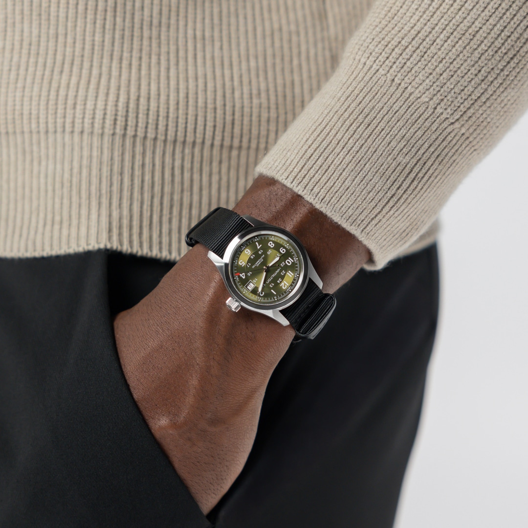 A faithful recreation of its original 1960s forebear, the Khaki Field Auto 38mm features our iconic H-10 automatic movement to deliver an 80-hour power reserve. Inspired by our military roots, this rugged, Swiss-made timepiece features a stainless steel case, green dial with multi-textured finishings and Super-LumiNova®-coated hands for low-light visibility. A durable black NATO strap reinforces its tactical edge, making it ready for action and any occassion.