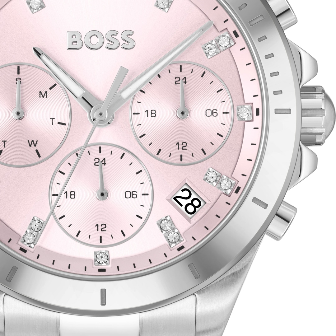 The Hugo Boss Alley ladies' watch has a precise quartz movement that guarantees reliable timekeeping. The watch is also water-resistant up to 5 ATM (30 metres). Whether in the office, while shopping or at dinner, the Hugo Boss Alley ladies' watch will add that certain something to your outfit and is guaranteed to attract admiring glances. This watch is a must-have for any fashion-conscious woman who wants to emphasise her style with a high-quality accessory. With the Hugo Boss Alley ladies' watch, you are guaranteed to always make the right choice.