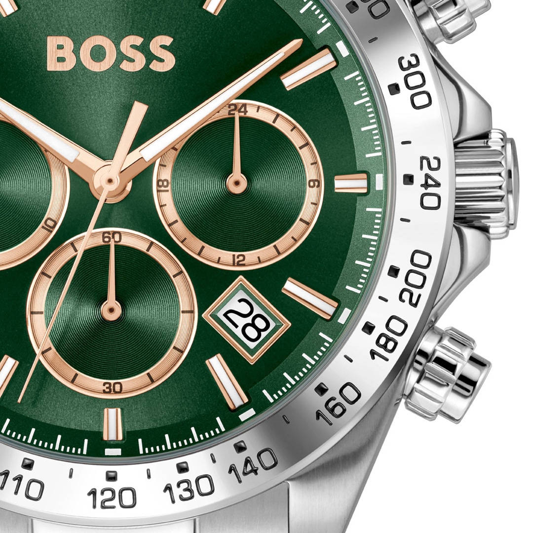 Elegant BOSS chronograph. This masculine men's accessory is crafted from stainless steel with a brushed and polished finish. A sunburst dial adds a sporty touch. A protected button, a high-quality strap and a tachymeter on the bezel add a touch of sophistication. Luminous hands and hour indices ensure optimal readability in the dark.