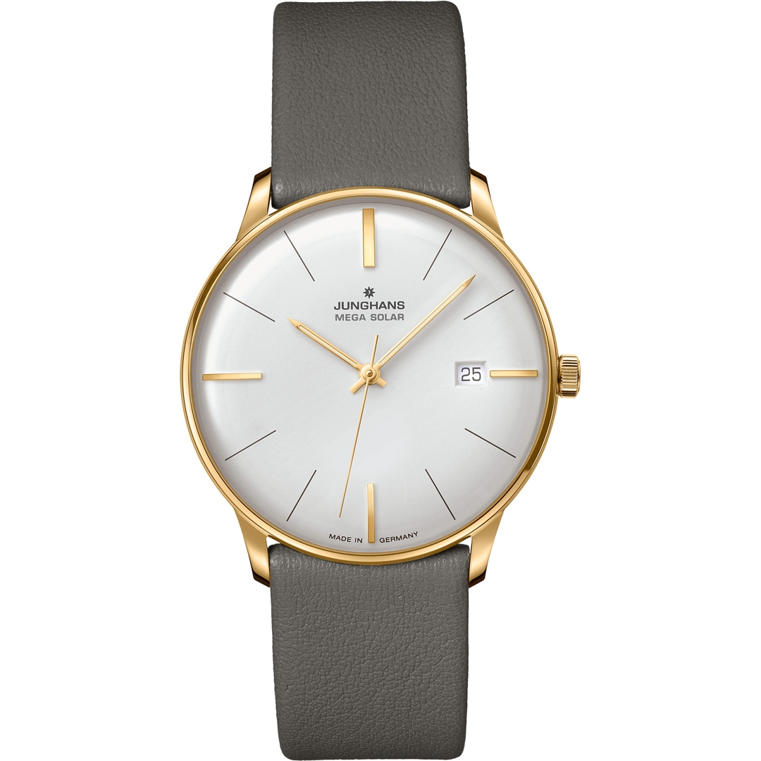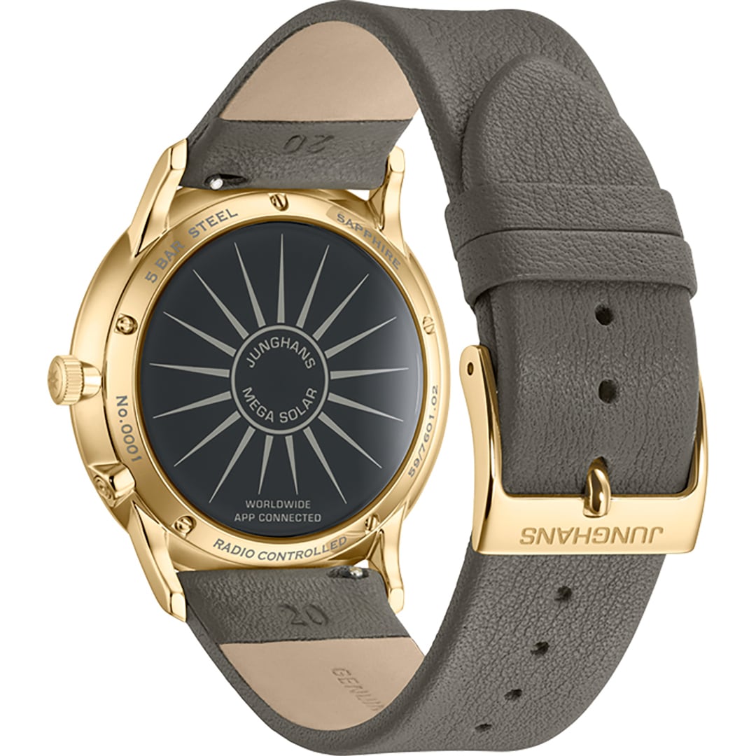This watch unites two of Junghans' core competencies: exquisite watch design and in-house radio-controlled technology. Outside the range of radio signals, the watch can be easily adjusted via the crown or with the Junghans app. The Meister MEGA Solar is also highly sustainable, thanks to its solar-powered movement.