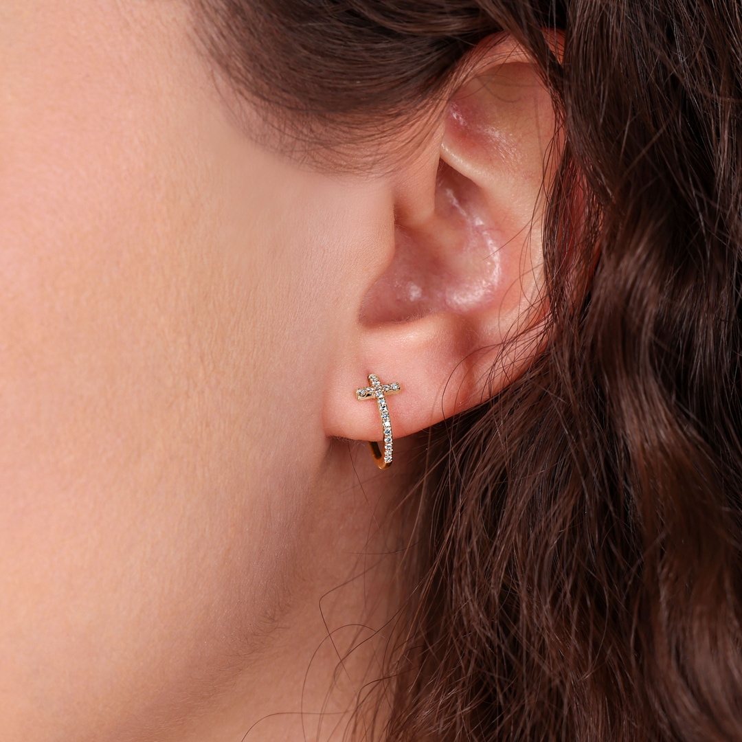 These impressive hoop earrings in 750/18 carat rose gold are more than just earrings - they are an expression of style and meaning. A cross is incorporated at each end of the hoops, a powerful symbol that stands for faith and constancy. The front cross is adorned with 18 sparkling diamonds that catch the light with every movement and create a mesmerising sparkle.