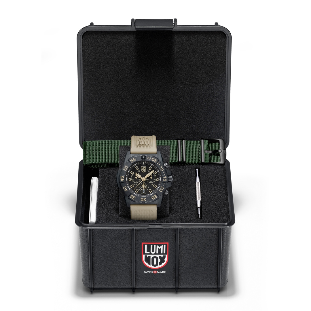 The Luminox Navy Seal Chronograph stands out for its design, water resistance up to 20 ATM, and the use of a Ronda quartz movement. Additionally, it features the exceptional H3 lighting system from the Swiss company mb-microtec. The self-powered illumination (up to 100 times brighter than conventional watch illumination systems) displays the time at a glance - regardless of lighting conditions, without relying on daylight charging, and without the need to press a button. The case and unidirectional rotating bezel are made from CARBONOX™, an innovative carbon composite material that is a hallmark of Luminox. Thanks to their high-quality technology and durability, Luminox watches withstand the toughest conditions and are used worldwide: the U.S. Navy SEALs and other international elite units trust Luminox. Luminox watches accompany every adventure, ensuring you are in the right place at the right time.