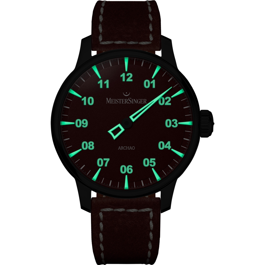 With the Archao, the MeisterSinger collection welcomes yet another strikingly characterful addition in this anniversary year. The bold, appliquéd hour markers echo the divided single hand and already reveal its secret: throughout the day the Archao absorbs light, only to release it at night in a display of maximum luminosity. The prominent hour markers, the double-digit numerals, and the distinctive, needle-shaped hand are crafted as white LumiBlocks, which store light like a battery during the day to unleash their enduring brightness after dark. The result is a picture-perfect timepiece, by day and by night.