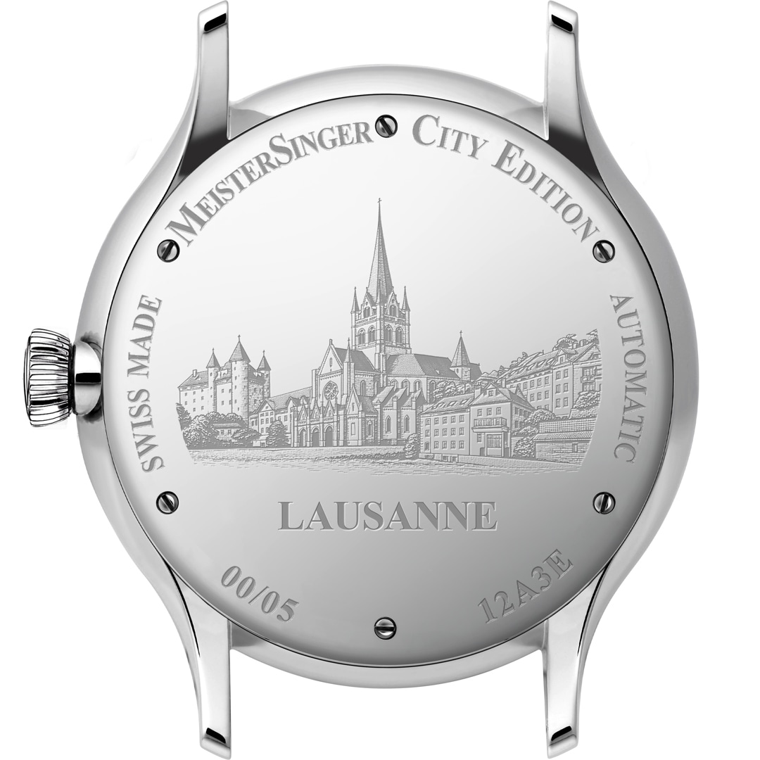 Wear the flair of the Olympic capital on your wrist every day. The MeisterSinger City Edition Lausanne masterfully captures the incomparable elegance of this vibrant city on Lake Geneva. The beautiful light-blue dial with a fine sunburst finish is reminiscent of the gentle glint of the waves in the sunlight. Elegant dark-blue appliqués perfectly round off the harmonious picture. A particularly charming detail is hidden above the six o'clock position, where a small plaque displays the delicate silhouette of the majestic Lausanne Cathedral.