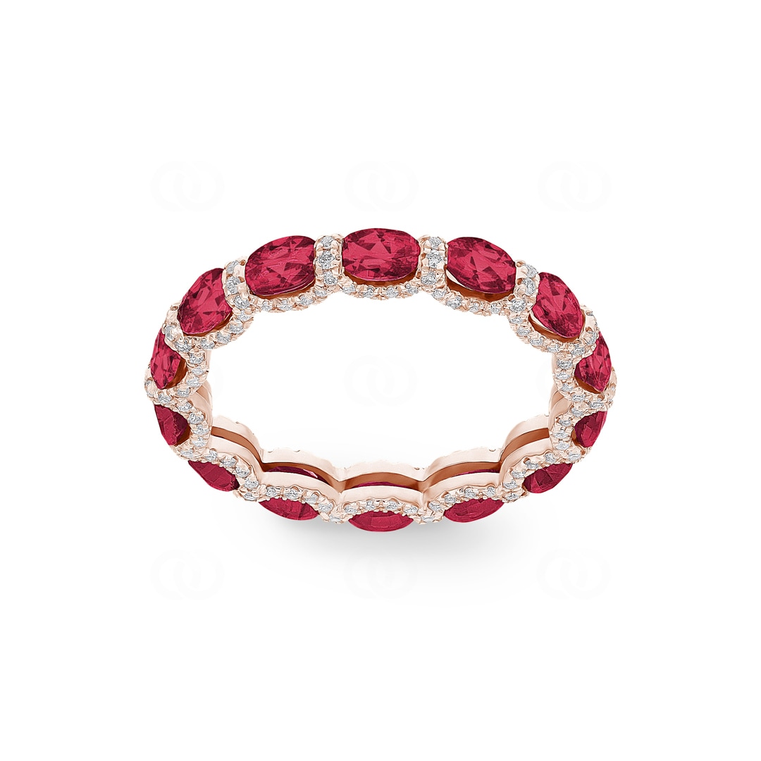 Imagine a ring that narrates stories - tales of past grandeur and timeless elegance. Cast in delicate rose gold, 14 ruby-red gems shimmer like luminous beacons, deftly cradled by diamond arches that pay homage to nature's splendour.