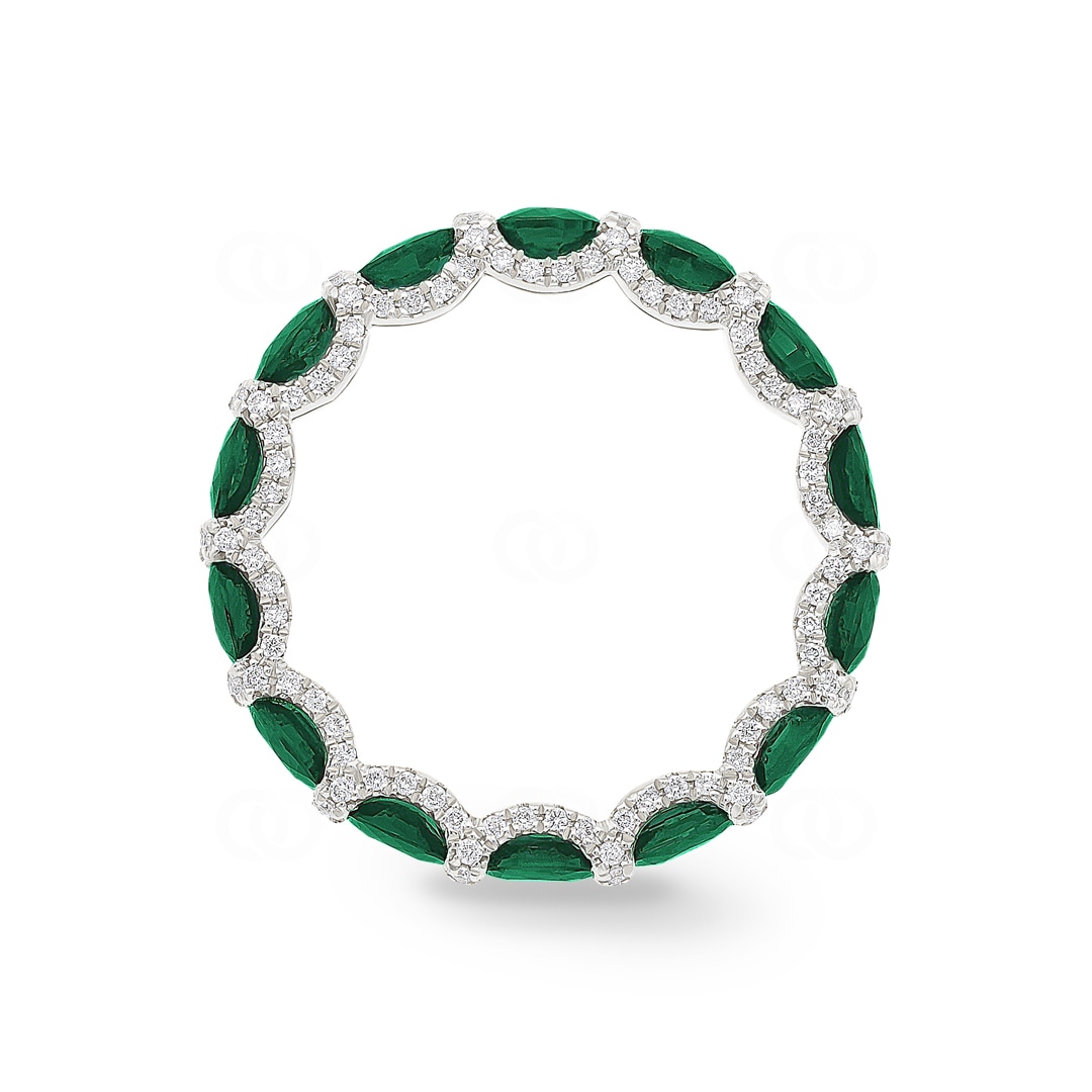 Imagine a ring that weaves tales - tales of past grandeur and timeless elegance. In its rich white gold, 14 emerald green gems gleam like concealed treasures, delicately cradled by arcs of diamonds, as if upheld by nature's own artistry.