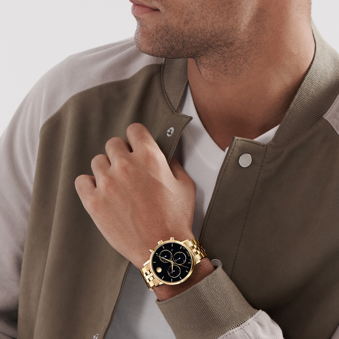 The 42 mm stainless steel case gives the watch a striking presence, while the chronograph dial with three sub-dials and the unmistakable Movado dot captures a fascinating dynamic. Slender hands dance across the time, emphasising the elegance of every movement.
