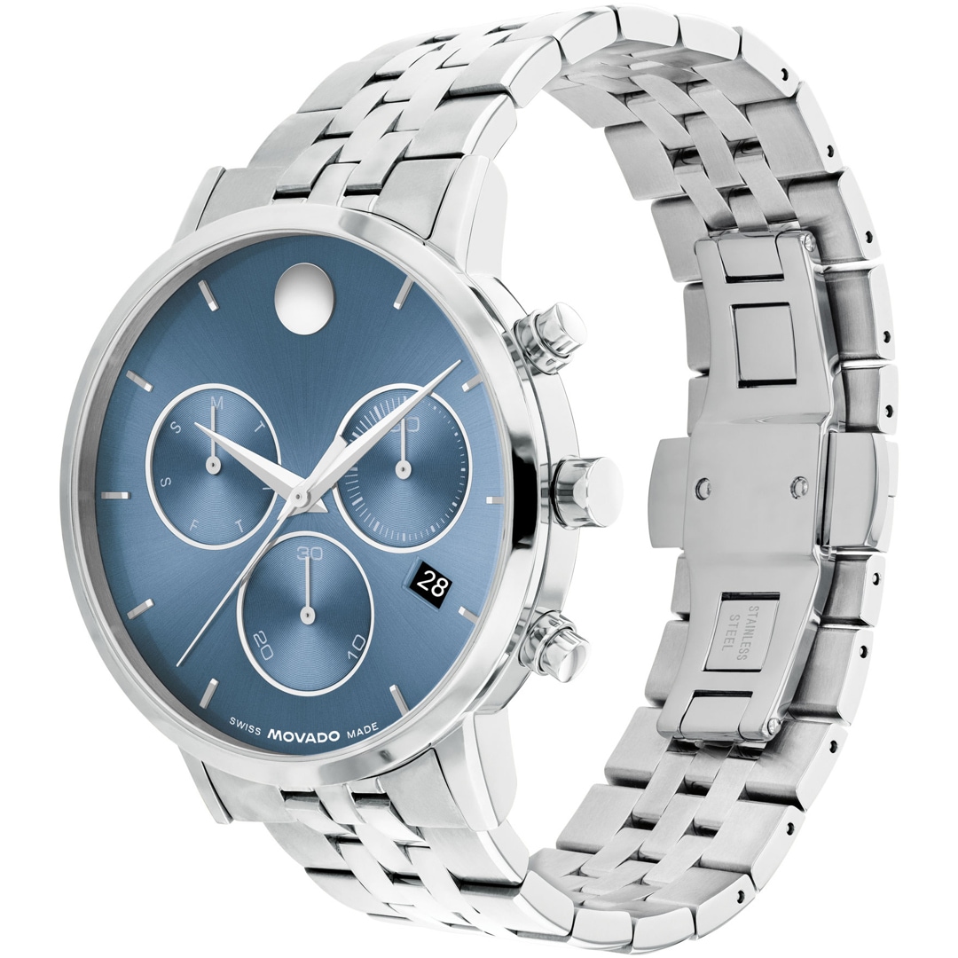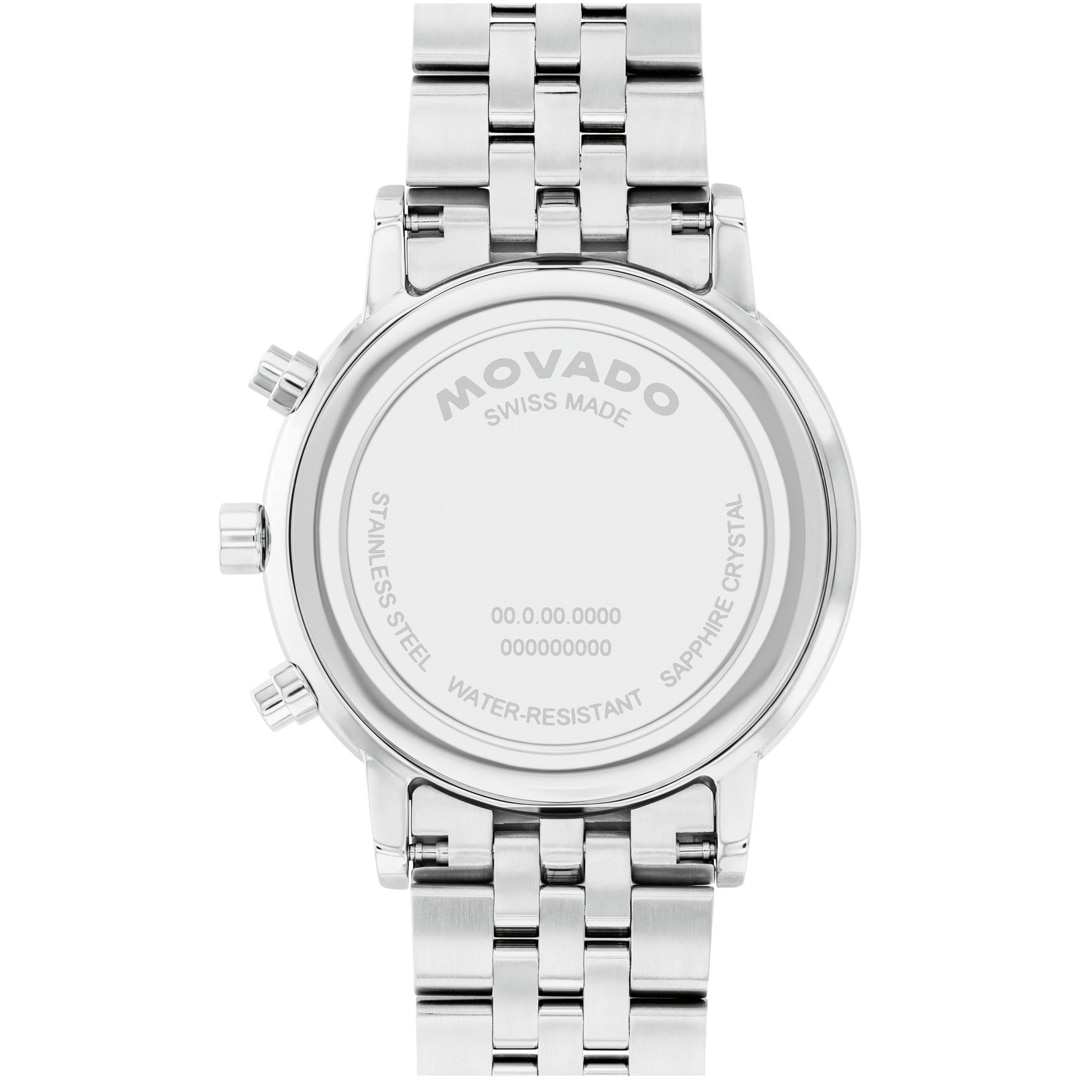 The 42 mm stainless steel case gives the watch a striking presence, while the chronograph dial with three sub-dials and the unmistakable Movado dot captures a fascinating dynamic. Slender hands dance across the time, emphasising the elegance of every movement.