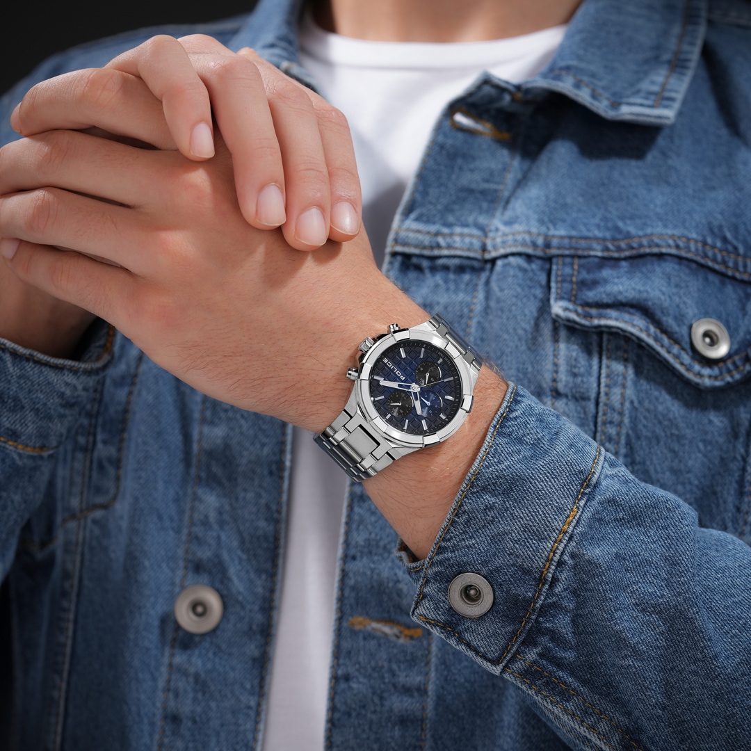 Guardian walks the line between street strength and refined control. With a commanding 42x53mm case and a uniquely constructed topring, this multifunction machine brings the attitude in full. The gradient dial shifts from deep black to navy and carries checkered detailing that adds grit to the surface. White-infused indexes and bold sub-dials lock in day, date, and 24-hour time with sharp precision. The textured build feels engineered, not just designed.