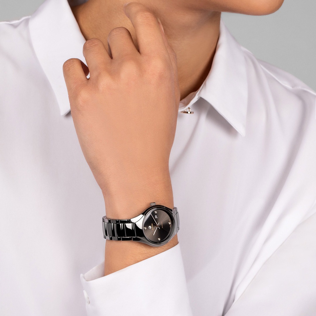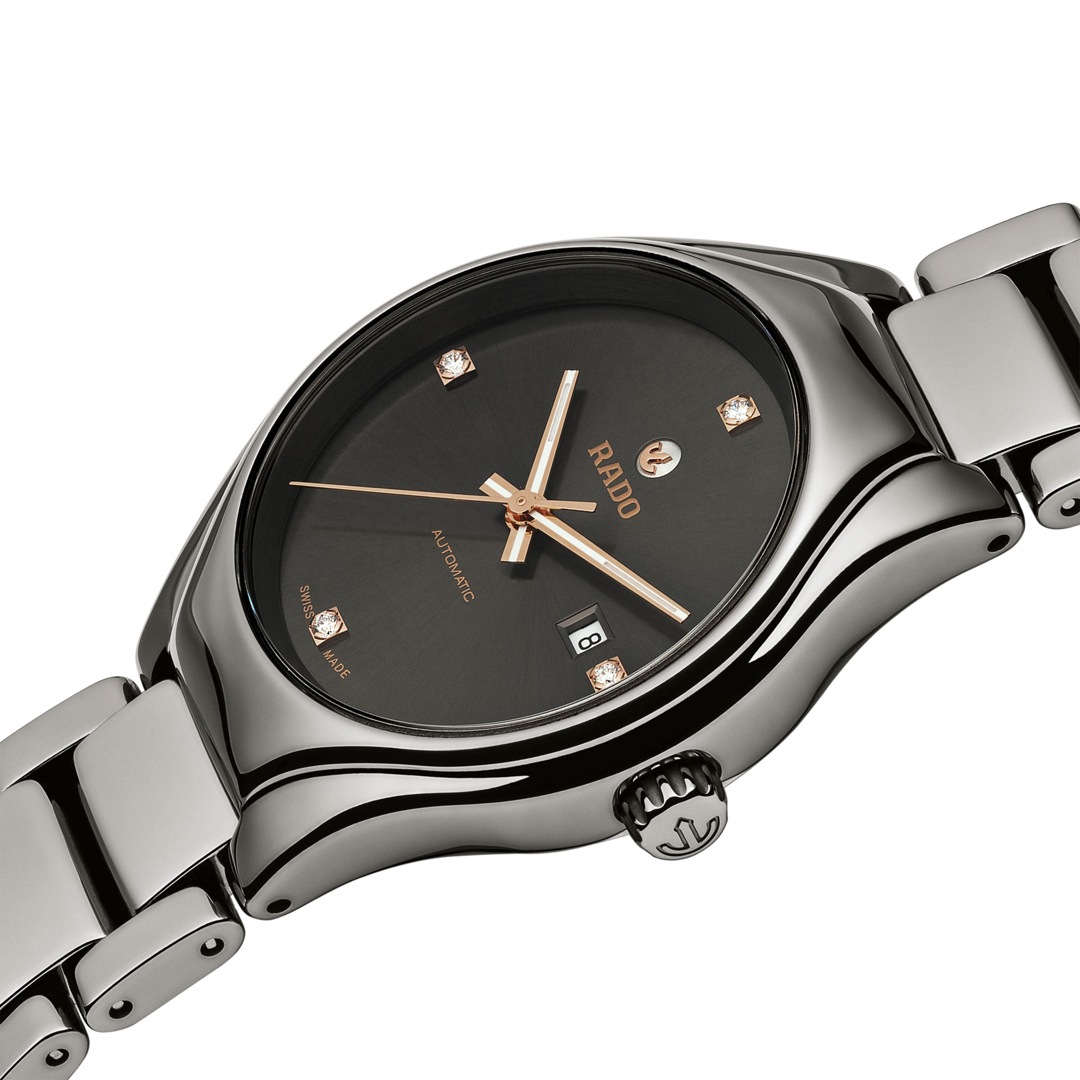 Reimagined for modern wearers, redesigned, but reliably and distinctively Rado, the True is a perfect, polished package with a quality Swiss automatic movement and the added allure of diamonds. It will keep its shine for years to come while also offering lightness and wearer comfort. This is True.
