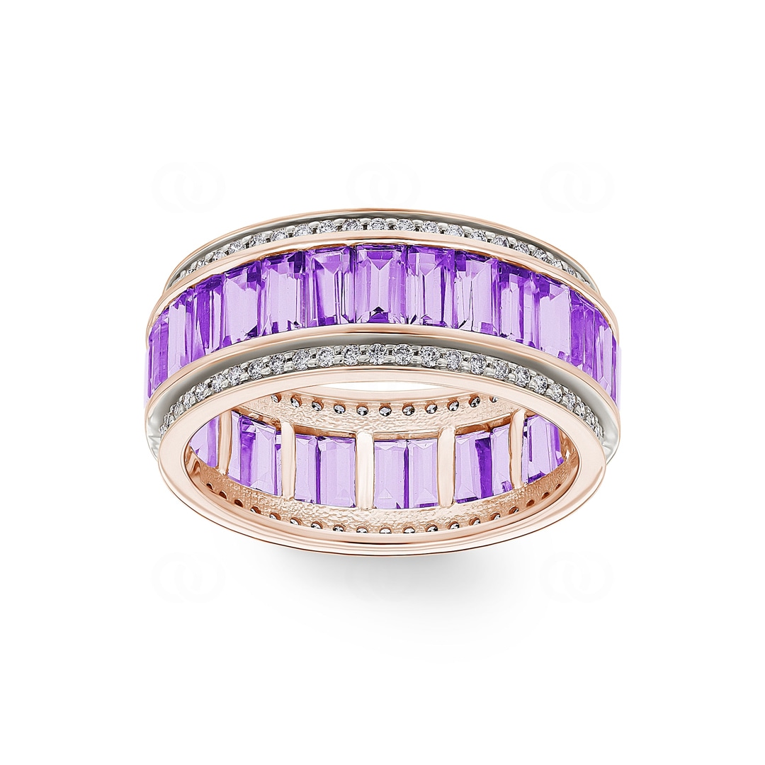 This 18-karat rose gold ring is a captivating interplay of opulent colour and radiant brilliance, designed to make a memorable statement. At its centre, a continuous row of 30 baguette-cut amethysts commands attention. Their deep, rich purple gives the ring exceptional depth and a majestic presence. The intense line of colour is flanked on both sides by rows of sparkling diamonds. In total, 108 diamonds create a stunning contrast and maximize the amethysts’ brilliance.