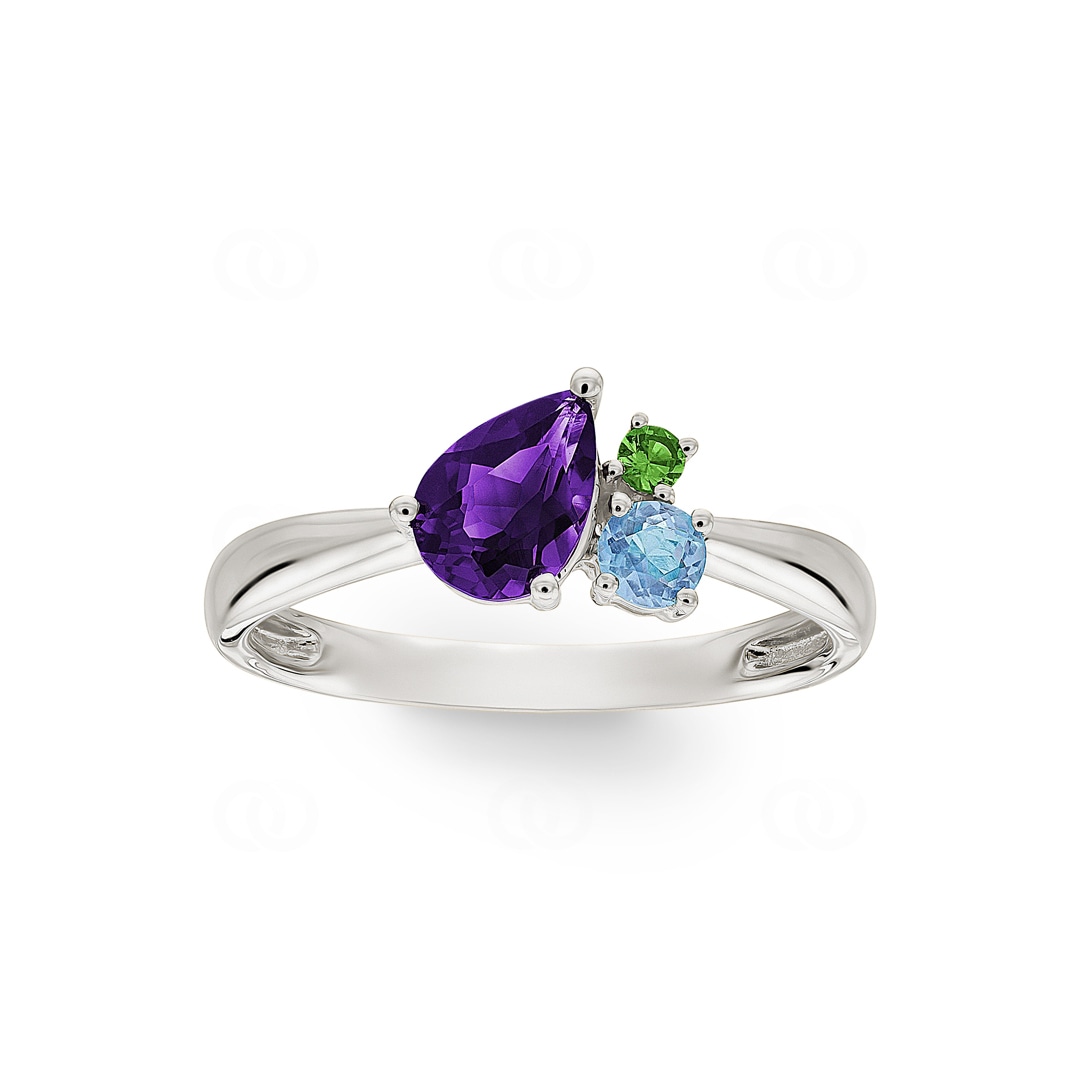 This ring crafted from gleaming 18-carat white gold is a statement of individuality and pure joy of life, far removed from the classic standard. The design stages a fascinating trio: the deep violet amethyst in an elegant pear cut forms the striking focal point. It is accompanied by the cool freshness of a blue topaz and the lively green of a tsavorite. This asymmetrical arrangement appears organic and playful, almost like a small, precious cluster of berries. It is a piece of jewellery that instantly lifts the spirits – a colourful vitamin booster for your look that adds an unmistakable accent to jeans as well as an elegant dress.