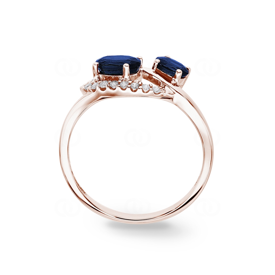 In a harmonious blend of sophistication and elegance, behold this enchanting ring crafted from radiant rose gold. Its asymmetrical, curved design exudes a distinctive aesthetic that captivates gazes and touches hearts. Two oval sapphires, each of varying sizes, form the radiant centerpiece of this masterpiece, akin to two sparkling jewels in the dawn's light. Surrounded by a total of eleven diamonds, gently capturing and reflecting the light in a fireworks display of brilliance. This ring is more than just a piece of jewellery; it is a symbol of individuality and beauty, uniquely accentuating the personality of its wearer.