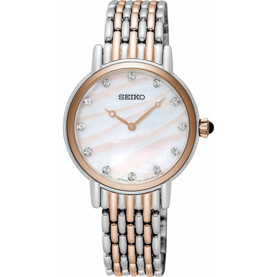Just as the world's best fashion designers rely on the perfect blend of fabric and cut, the Seiko Lady Quartz exemplifies the art of combining elegant lines with a classic design and refined materials. This timeless Seiko ladies' watch features a striking bicolour stainless steel bracelet and is fitted with a domed mineral crystal. The bracelet wraps comfortably around the wrist, ensuring both style and comfort.