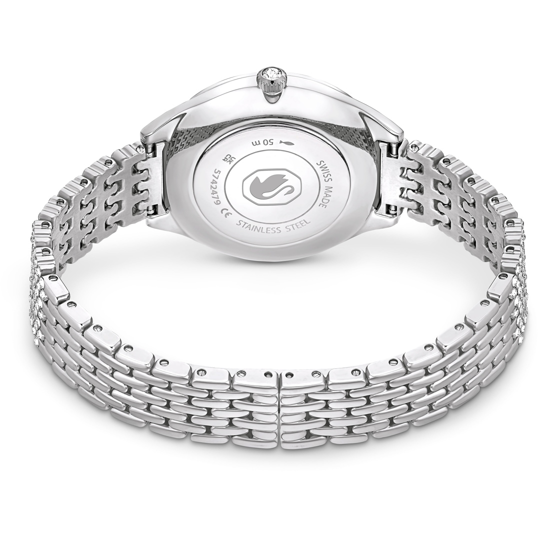 The simplicity of stainless steel has been beautifully lifted in this Swiss Made timepiece thanks to the compelling use of 433 crystals. On the silver tone guilloche dial, you’ll discover crystals for index markers, while the slender bezel and bracelet are each adorned with their own pavé of dazzling clear crystals. The 30mm watch is water-resistant to 50m and includes a single stone in its crown. The overall look is designed to make a subtle yet noticeable impact with any outfit you wear.