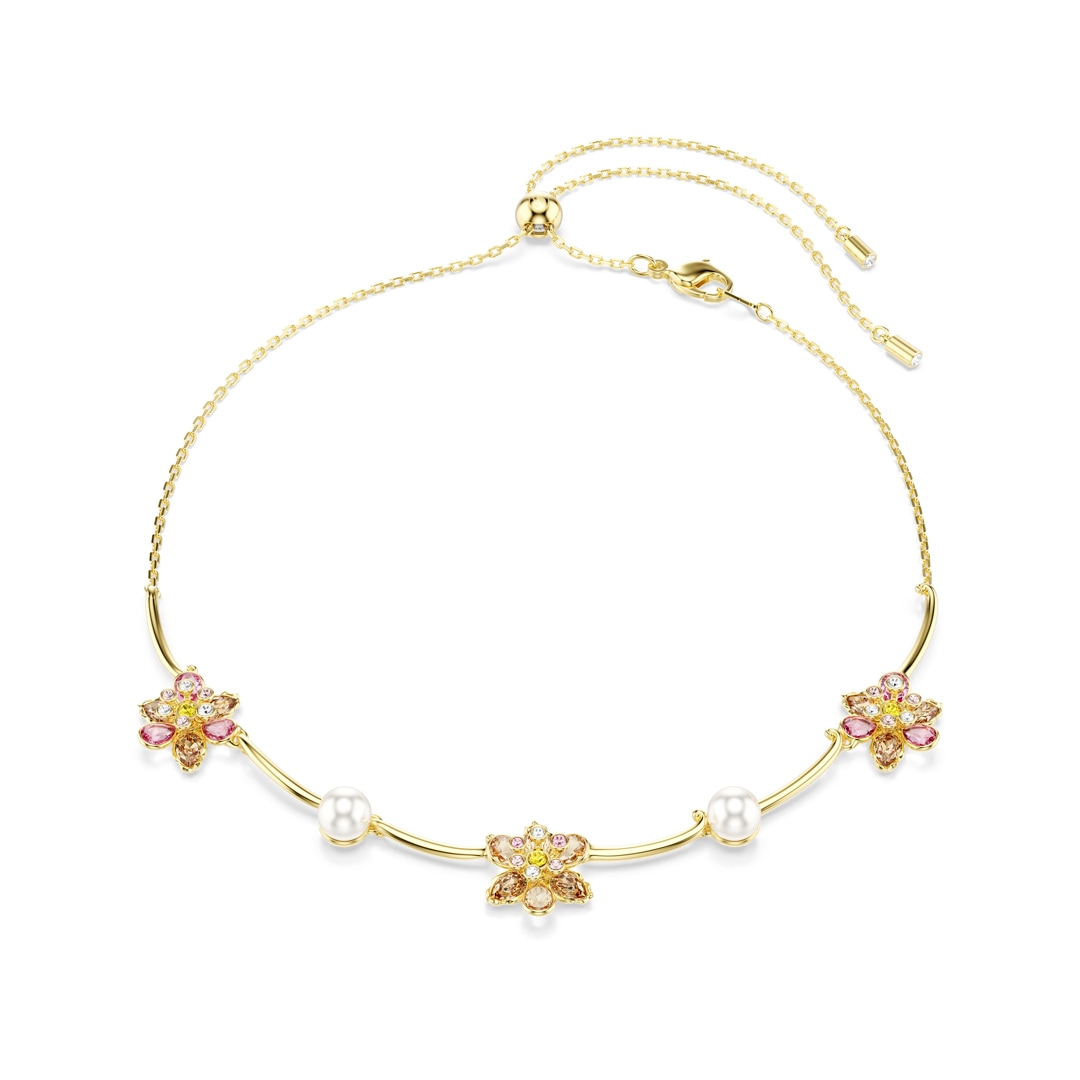 Nature and luxury are combined in this delicate yet stunning Idyllia necklace. On an adjustable chain, the all-around design features gold-tone plated bars, interspersed with Swarovski Crystal Pearls and three flowers, each made of crystals in various cuts and soft colors. It’s a touch of joyful elegance that pairs perfectly with a matching bracelet, brooch, or earrings.