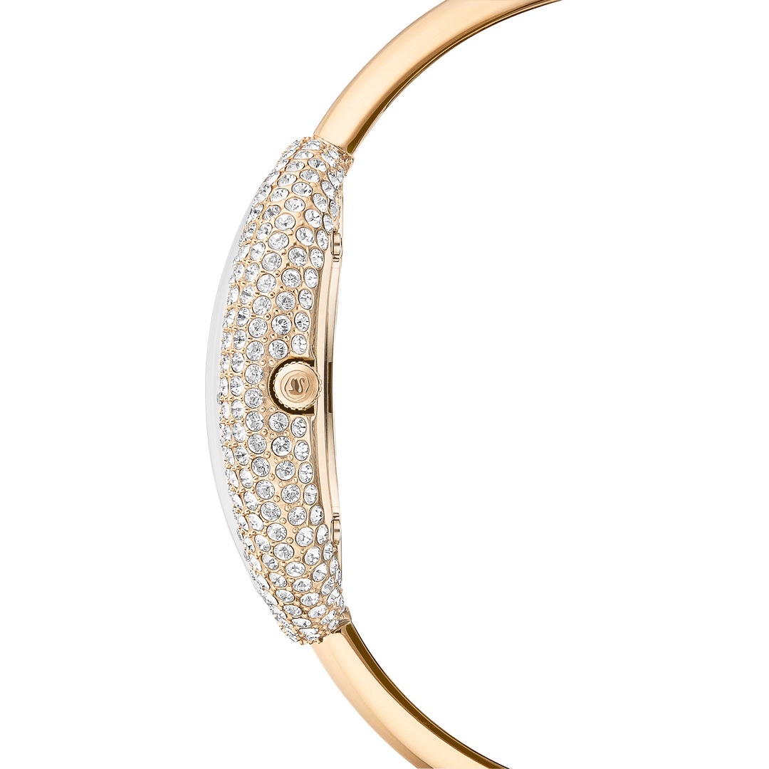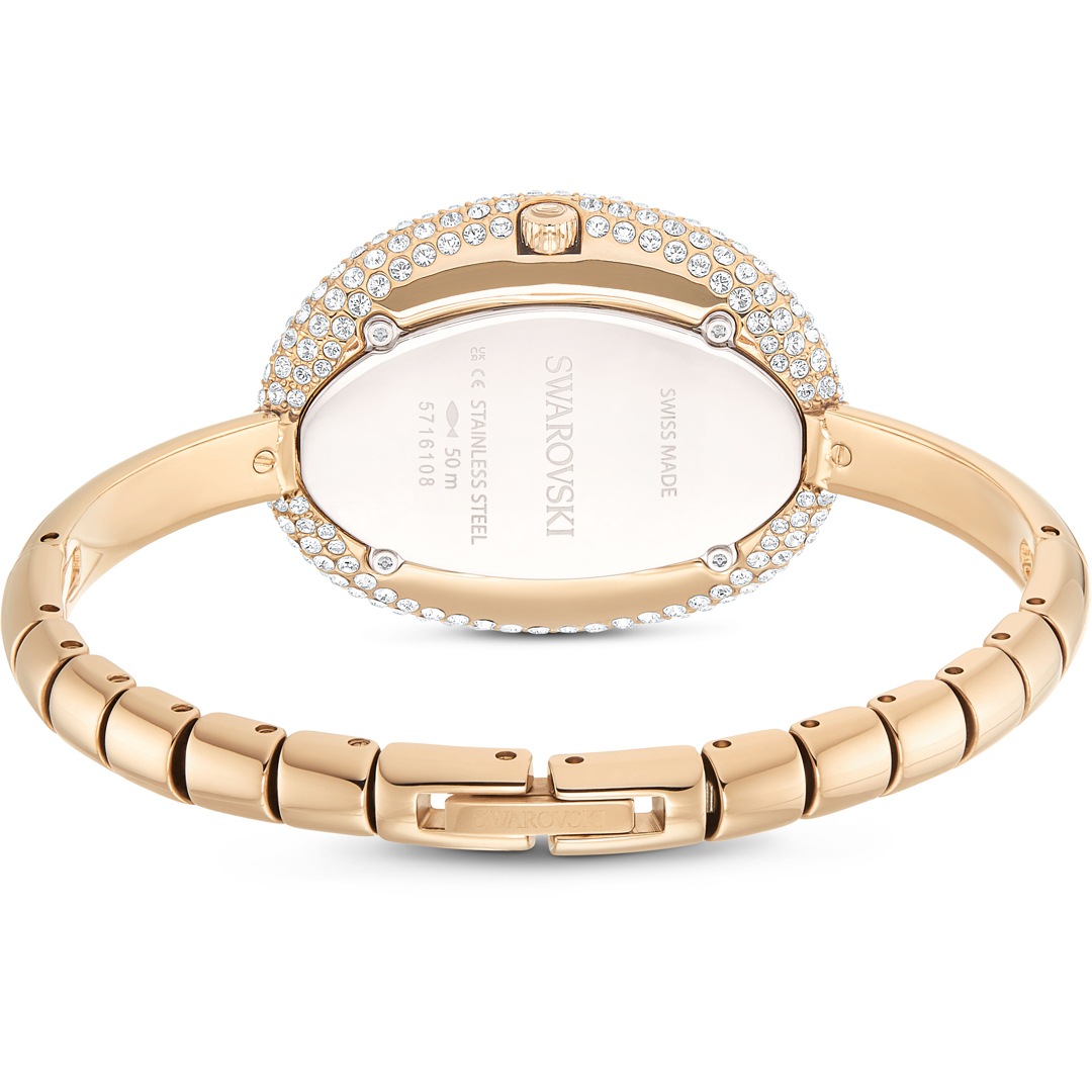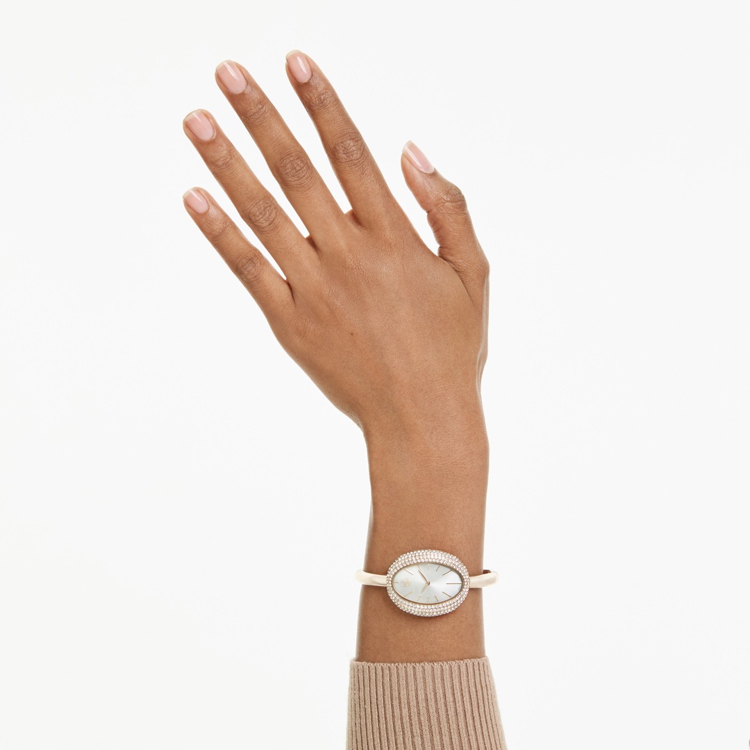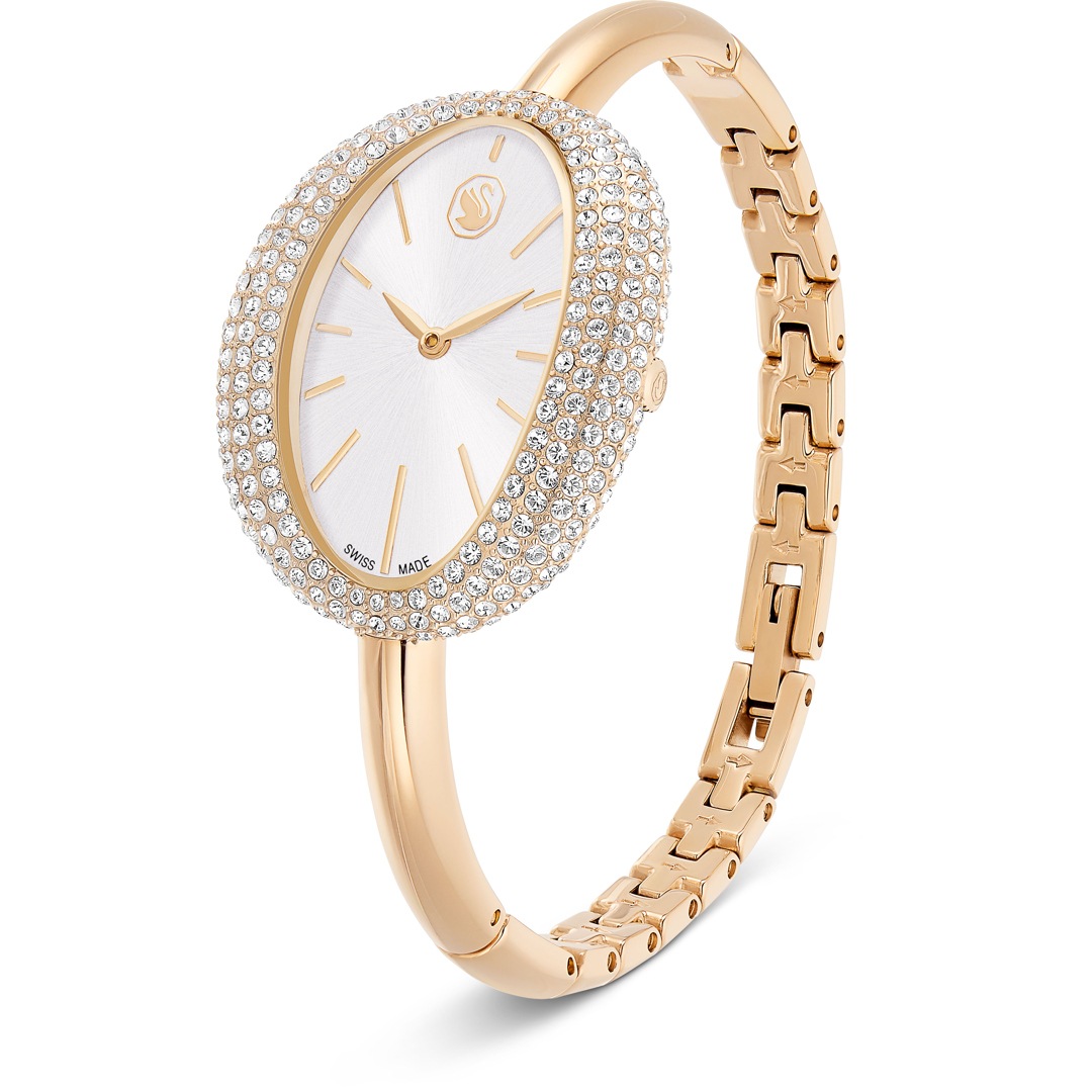 Playing with proportion, this Imber Bangle timepiece delivers a stunning silhouette in stainless steel with a champagne gold-tone finish. Its oval-shaped case has a bezel set with around 321 crystals, which provides a gleaming frame for the watch’s sunray dial. Around the wrist, a slender and adjustable bangle provides comfort and style at all hours. This Swiss Made watch is water-resistant to 50 meters and matches seamlessly with Swarovski’s Imber jewelry.