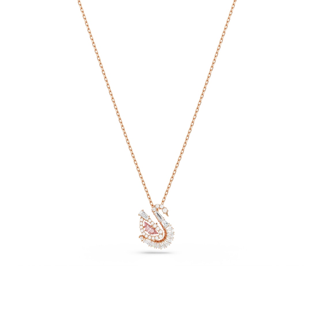 This pendant conveys the graceful movement of Swarovski’s iconic swan. Suspended from a rose gold-tone plated chain, the central motif reveals an elegant silhouette, adorned in clear Swarovski Zirconia and with a pink dancing stone in a swan body cut. This radiant detail creates an endless motion of color and light, and will keep your style shining at every moment.